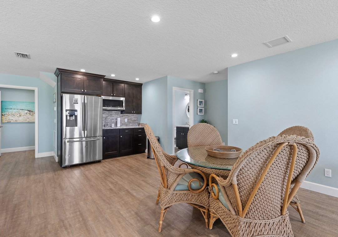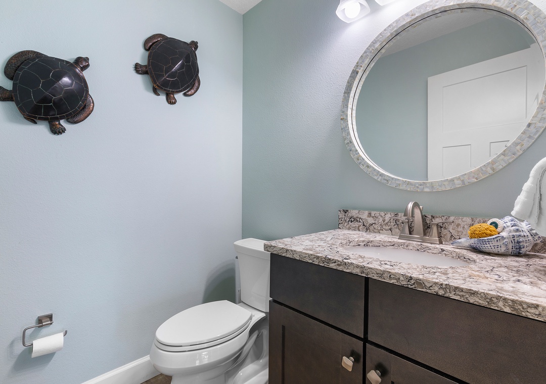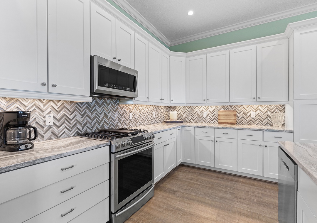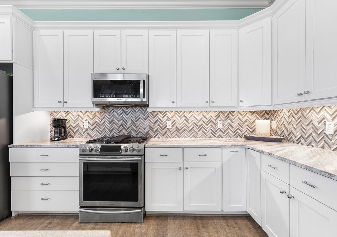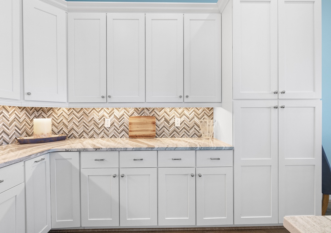 As you enjoy the gorgeous scenery, unpack your groceries in the updated kitchen. This space boasts of white cabinetry, stainless steel appliances, and marble countertops. You'll find it well stocked with dinnerware, cookware, a drip coffee maker, and all the essentials you need. Nobody will hesitate to wash dishes as the sink and island look onto the waves. When you're ready to eat, gather at the breakfast bar for 4 or the dining table for 8.
