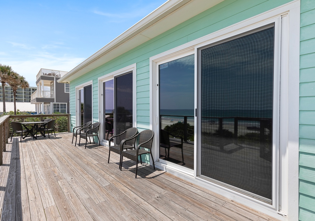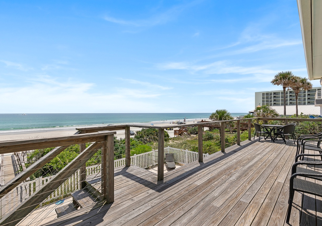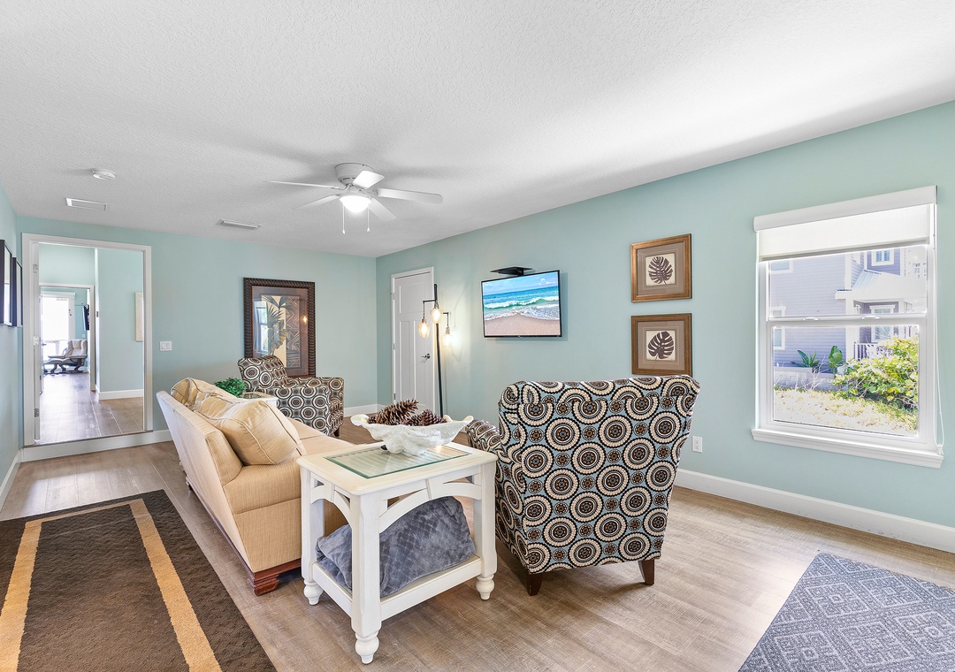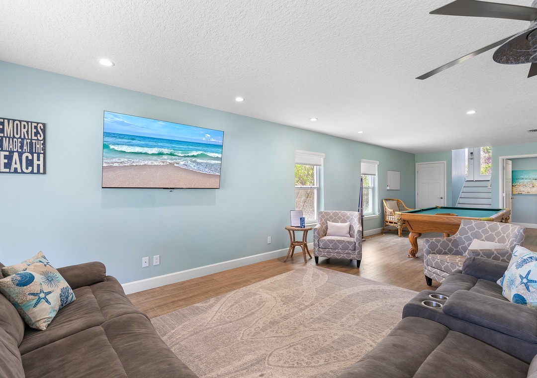 While the kids run off to play, the adults can kick back in the living area or on the balcony. The living room has a chaise couch, two armchairs, and a 4k Ultra HD Smart TV with cable and streaming service apps. Those who love to relax in the fresh air can head to the second-floor balcony. The balcony overlooks the pool below and the beach beyond.