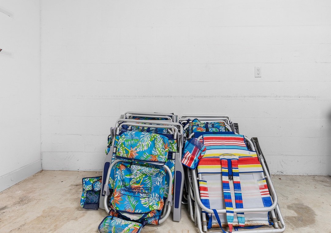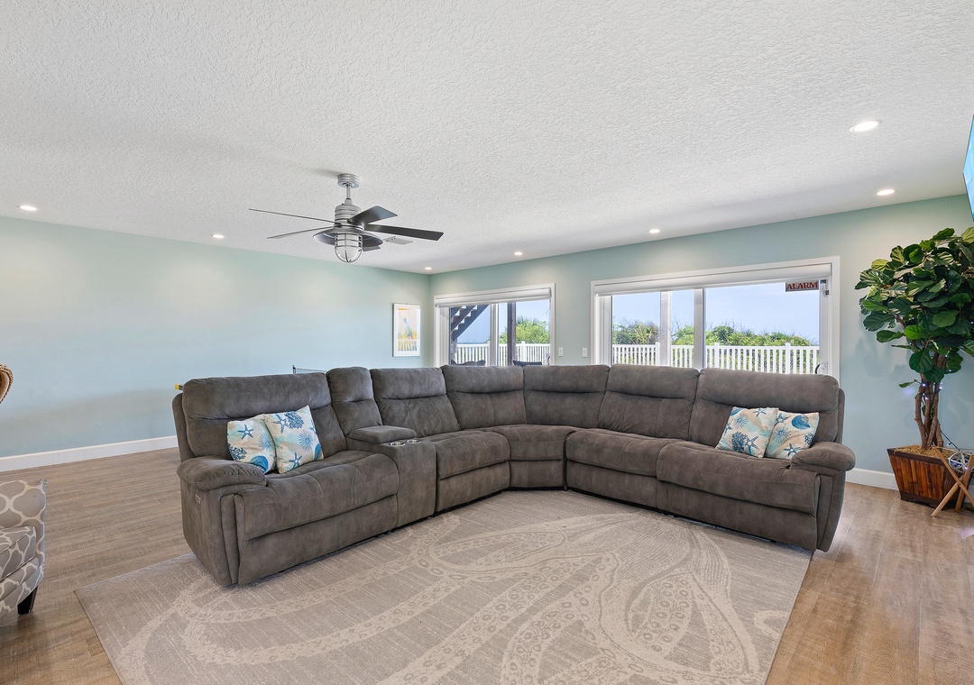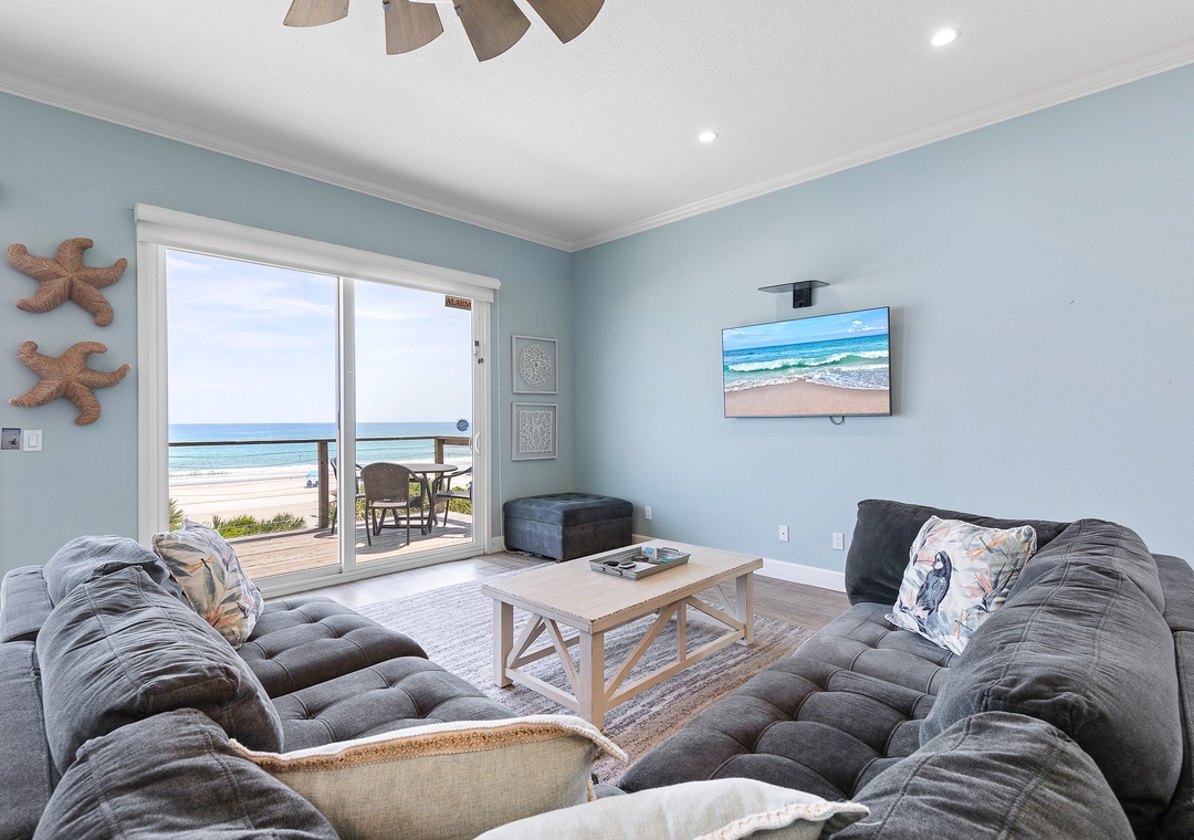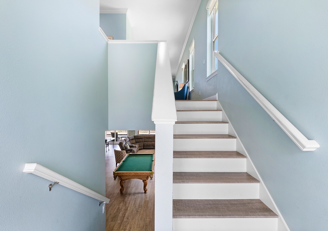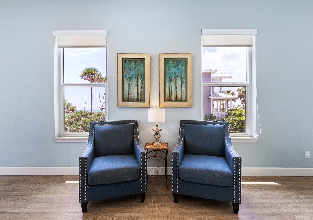 While the kids run off to play, the adults can kick back in the living area or on the balcony. The living room has a chaise couch, two armchairs, and a 4k Ultra HD Smart TV with cable and streaming service apps. Those who love to relax in the fresh air can head to the second-floor balcony. The balcony overlooks the pool below and the beach beyond.