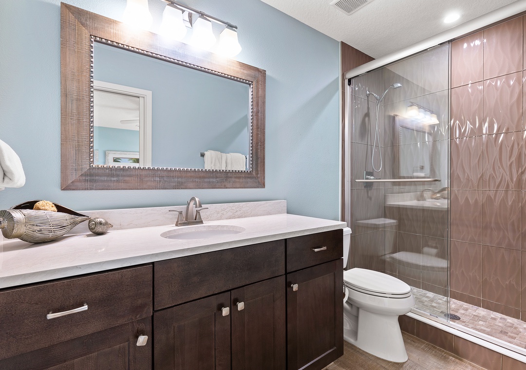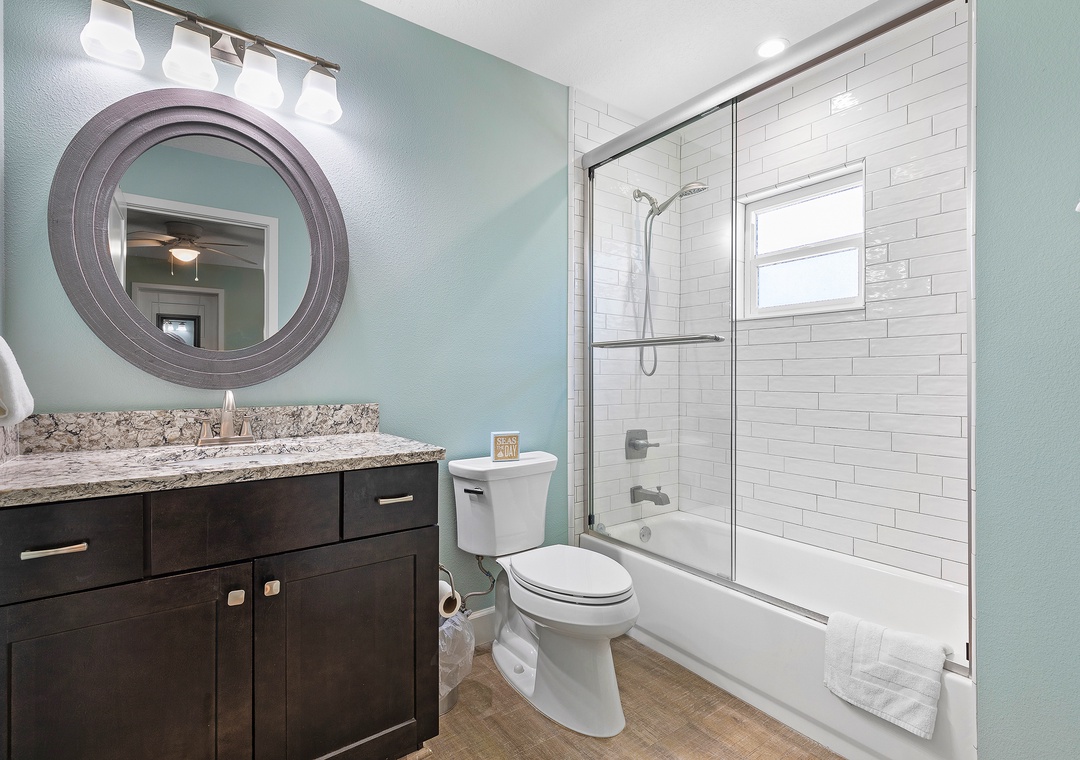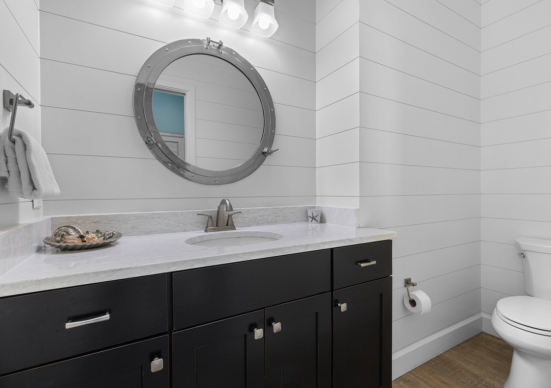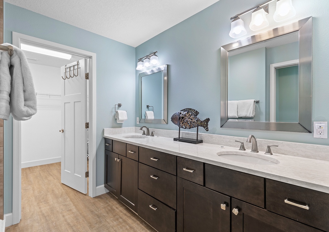 Downstairs located off the media room is the first-floor primary suite and a second bedroom with a queen bed and adjoining bathroom.