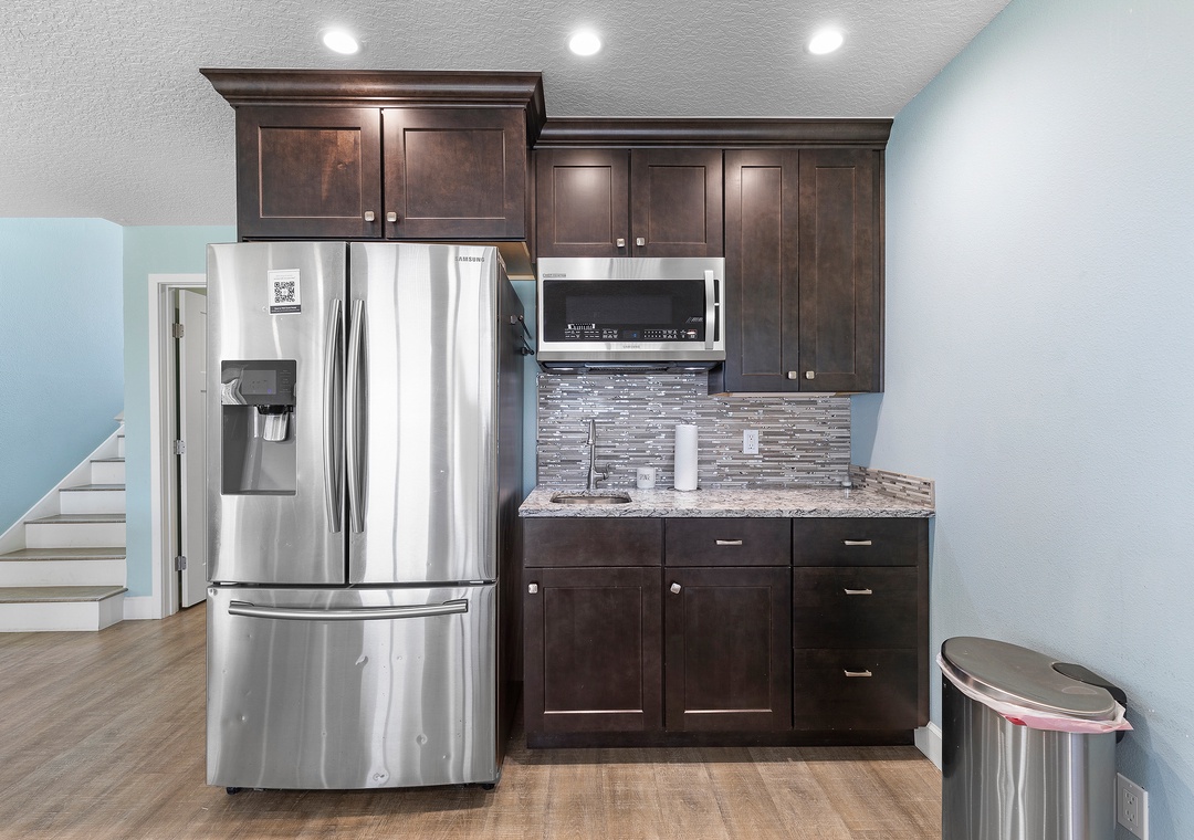 In the evenings, everyone can venture downstairs to the media room for fun and games. The media room has a living area with a Smart TV, pool table, ping pong table, dining set, and wet bar with stainless steel appliances. You'll find this is your kids' favorite part of the house!