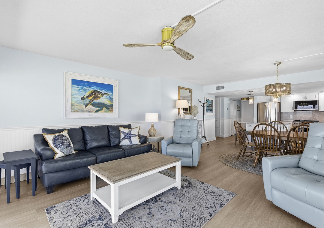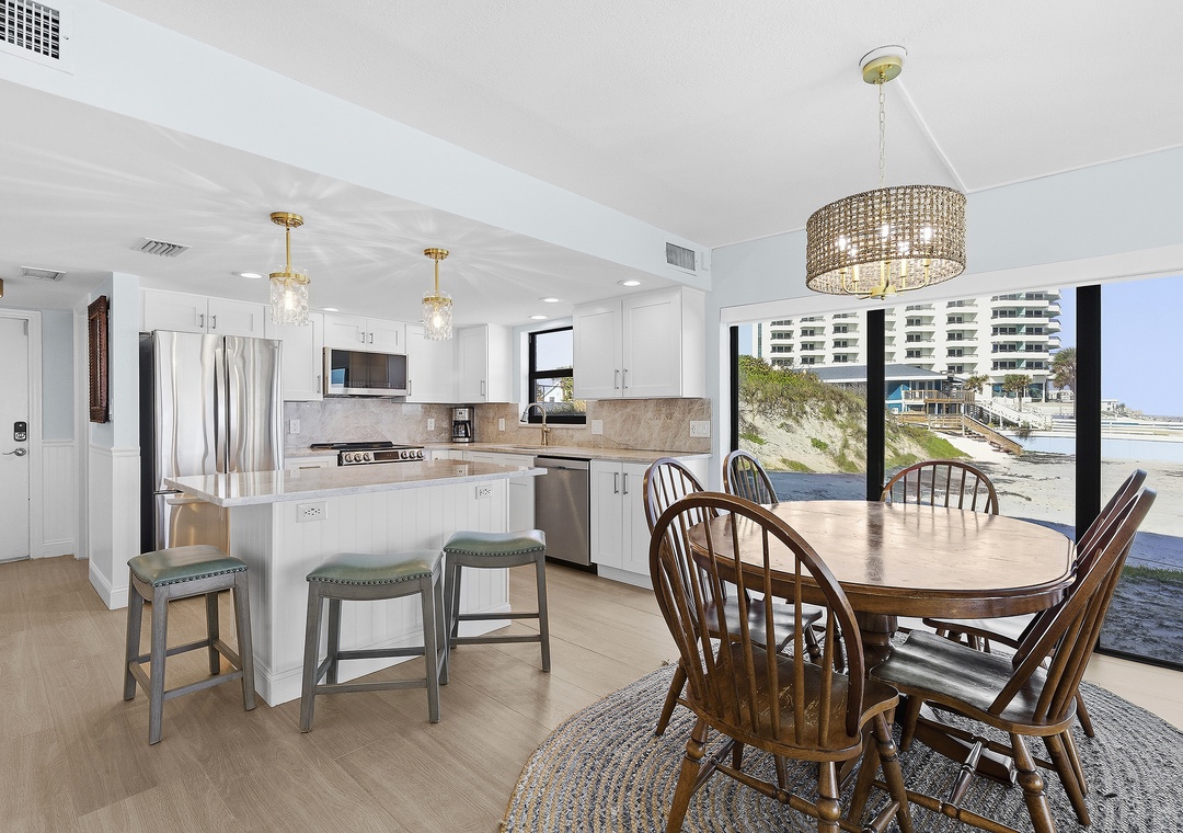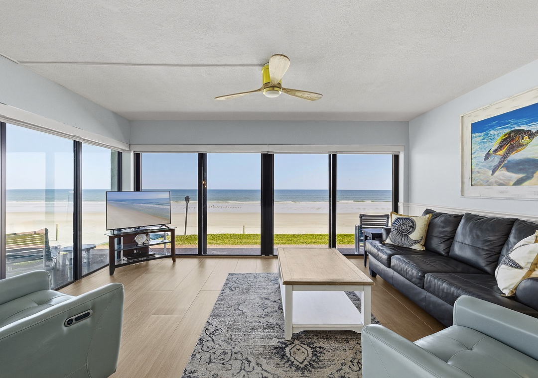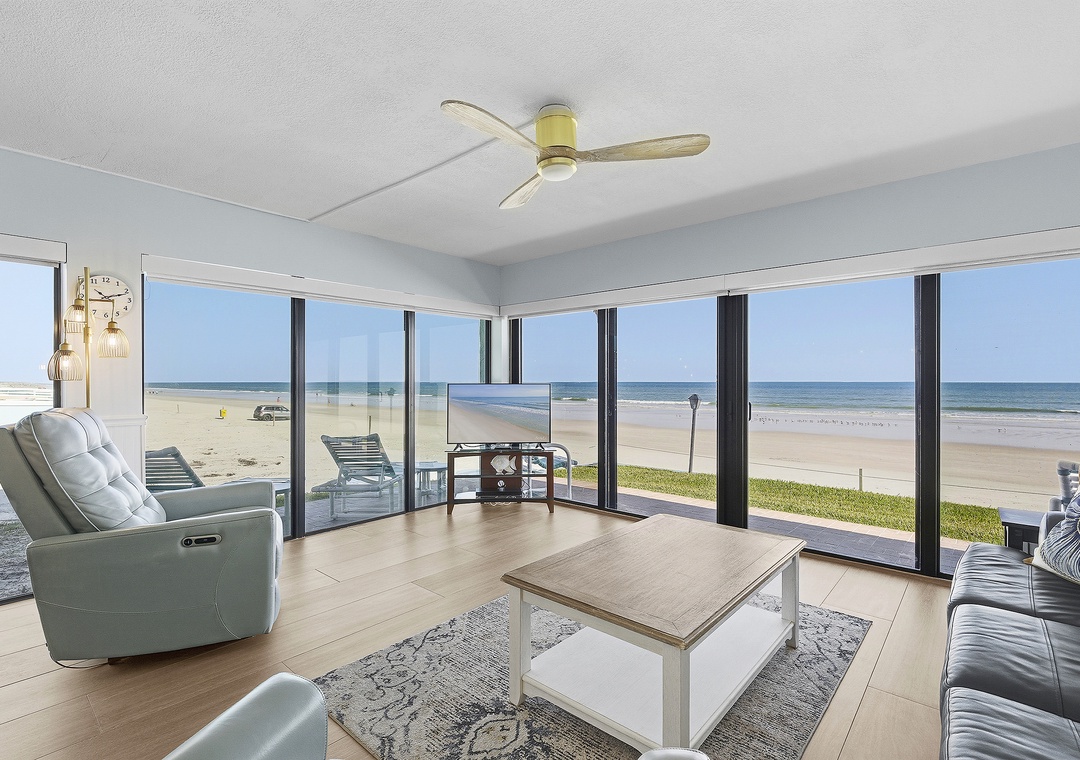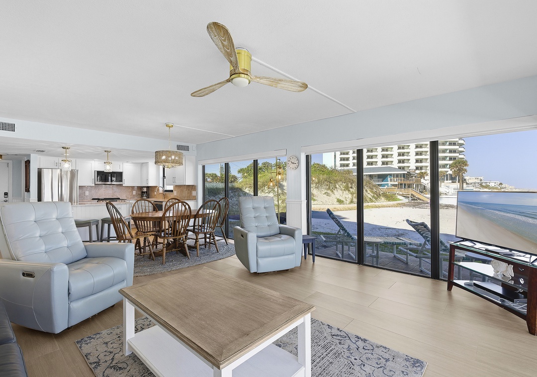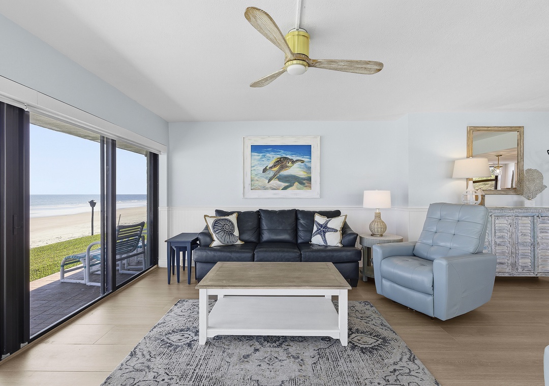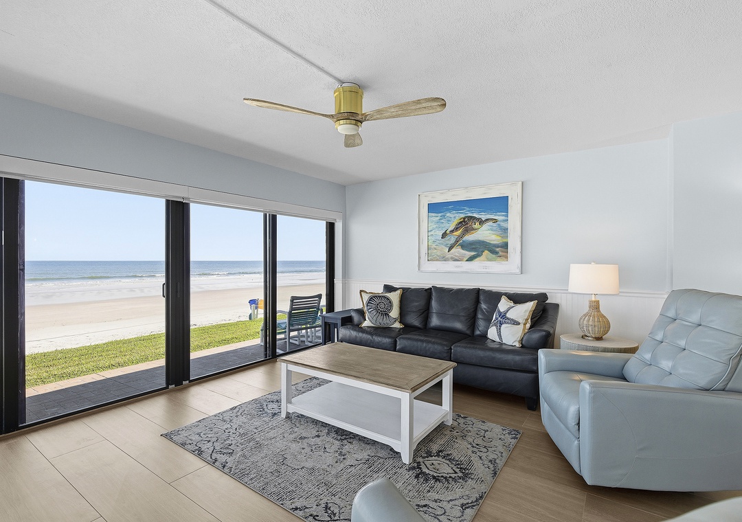 Welcome to Ocean Reef Villas 110, a beautifully renovated, beachy-decor corner oceanfront condo on the first floor. This spacious 3-bedroom, 2-bathroom unit sleeps up to 8 guests comfortably, featuring a primary bedroom with a king bed, a second guest room with two queen beds, and a third guest room with two twin beds. Enjoy floor-to-ceiling windows and sliders that highlight the unobstructed ocean views—your backyard is the beach, creating the feeling of being right on the sand. A grassy area between the patio and the shoreline offers the perfect space for kiddos to play, while the seasonally heated pool provides even more family fun