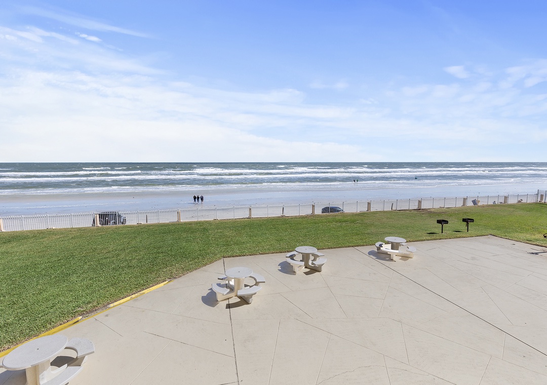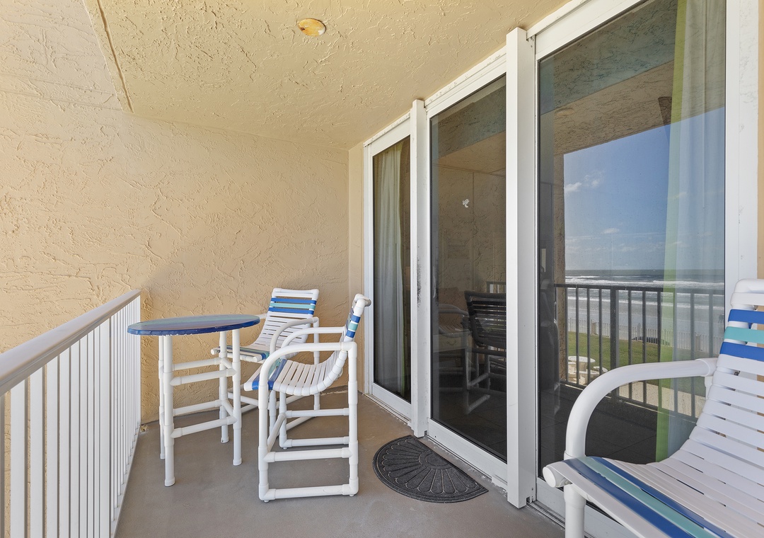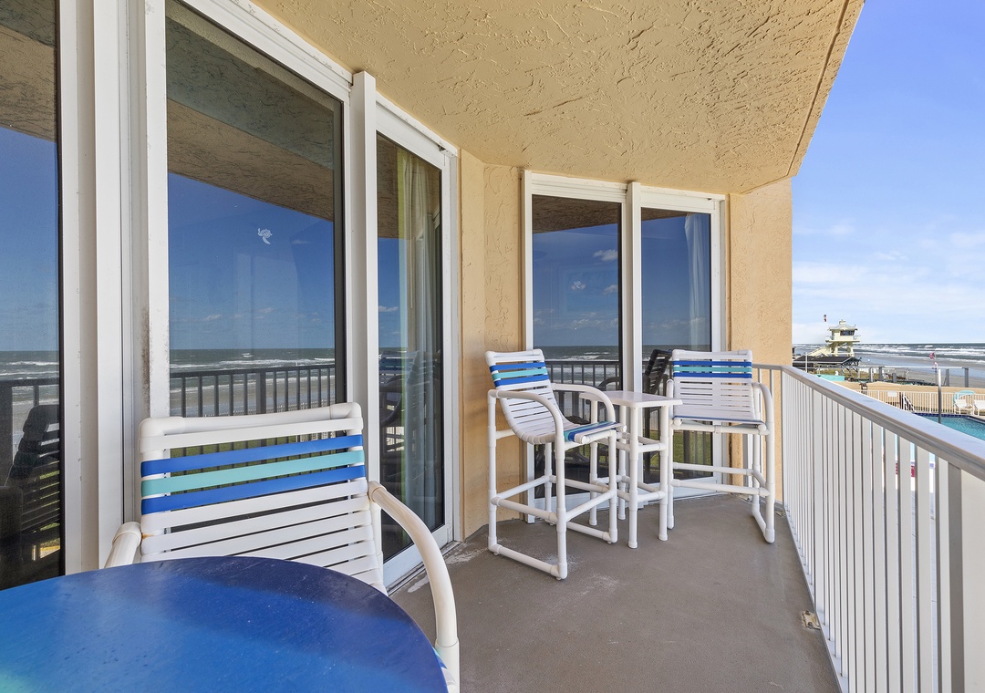 As happy hour approaches, take your cocktails and wine glasses to the condo's oceanfront balcony. The high-top table for two is the perfect spot to enjoy the second-floor view of the complex grounds, pool, and driving beach. In the morning, you can sip your coffee to the direct view of the ocean sunrise.