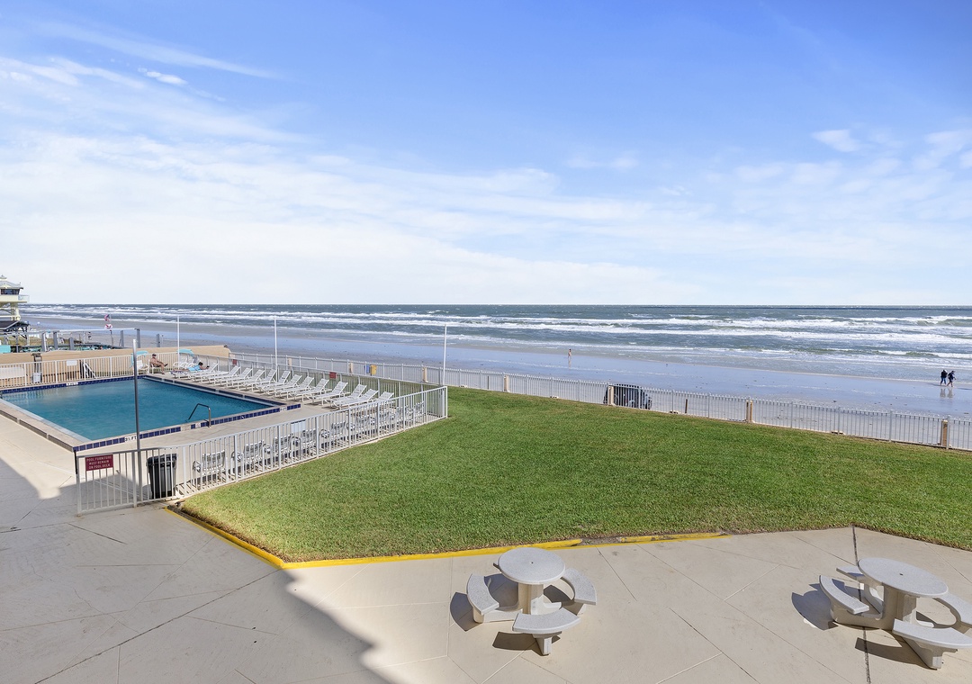 Oceania Plaza is an oceanfront complex that's walking distance from popular dining and shopping on Flagler Avenue. This complex boasts of a sundeck and pool, which is heated during the winter months, located directly on the beautiful Central Atlantic coastline. With lounge chairs lining the pool deck, and permanent dining tables surrounded by a small green lawn facing the ocean, you can choose to bask in the warm Florida sun around the pool or take your meals picnic style as you watch the waves roll in.