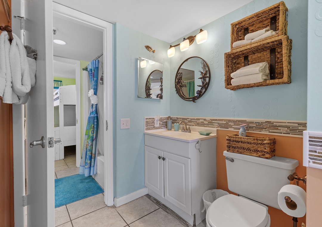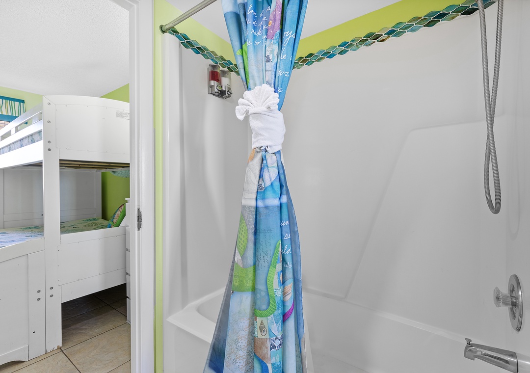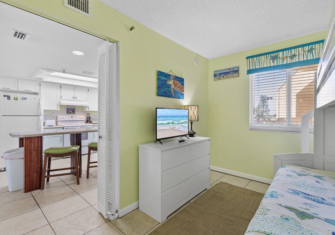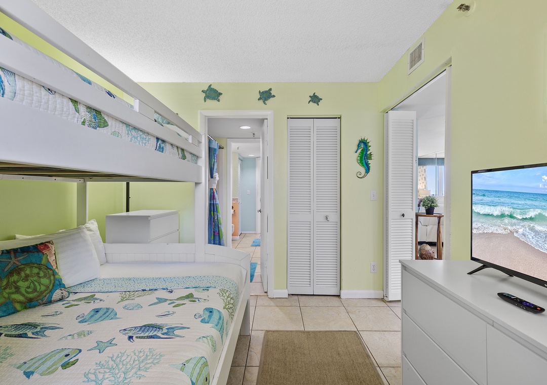 Similarly, the second bedroom sleeps three and has a flat-screen TV. This room accommodates guests with twin over full bunkbed. Nearby is a bathroom with a standard bathtub, moveable showerhead, and bath linens.