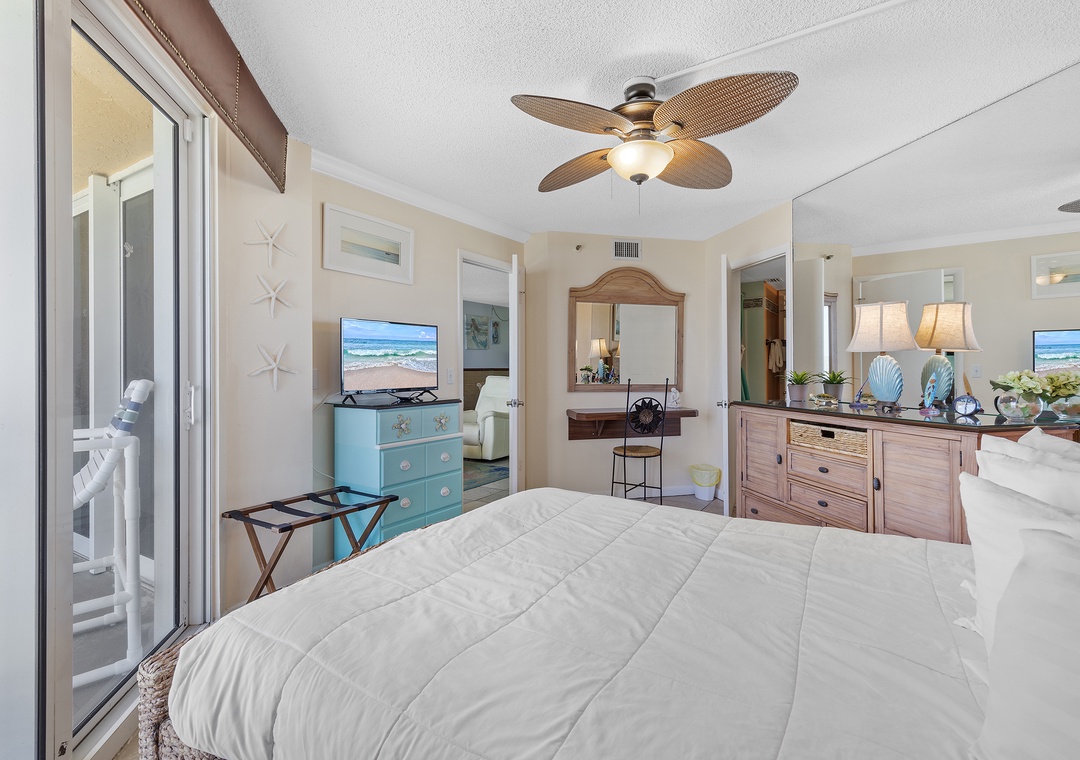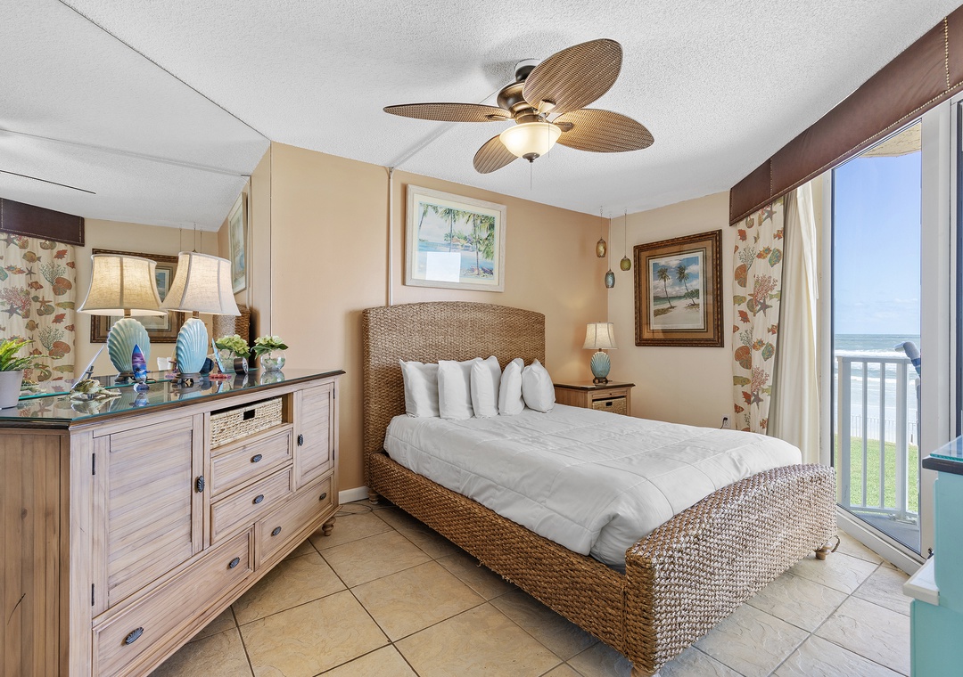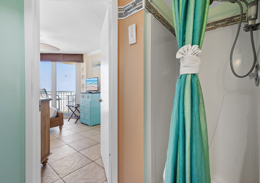 When you're ready for bed, slip away to the primary bedroom from its private balcony entrance. This room hosts a queen bed, flat-screen TV, and amazing oceanfront views. Guests are also provided ample dresser space and a small vanity. Adjoining is the primary bathroom which has a shower with a moveable showerhead and soft bath towels.