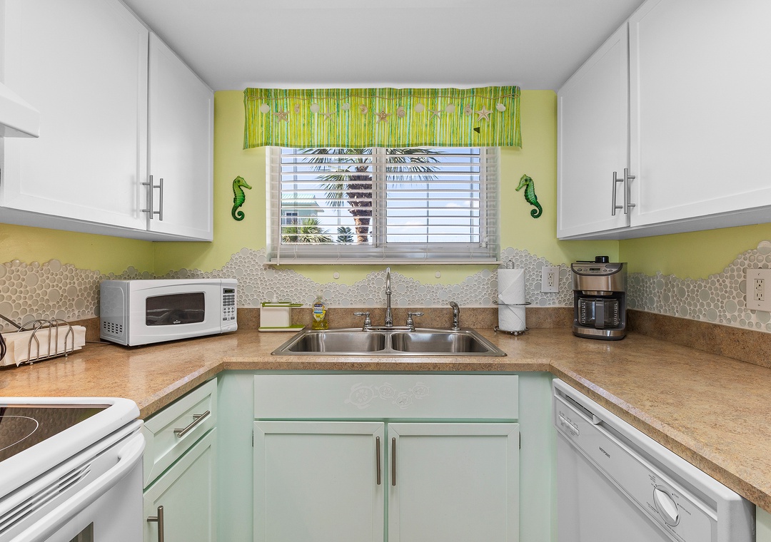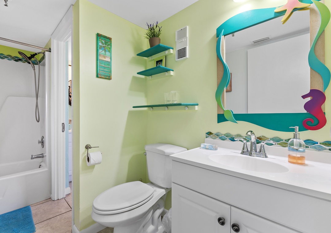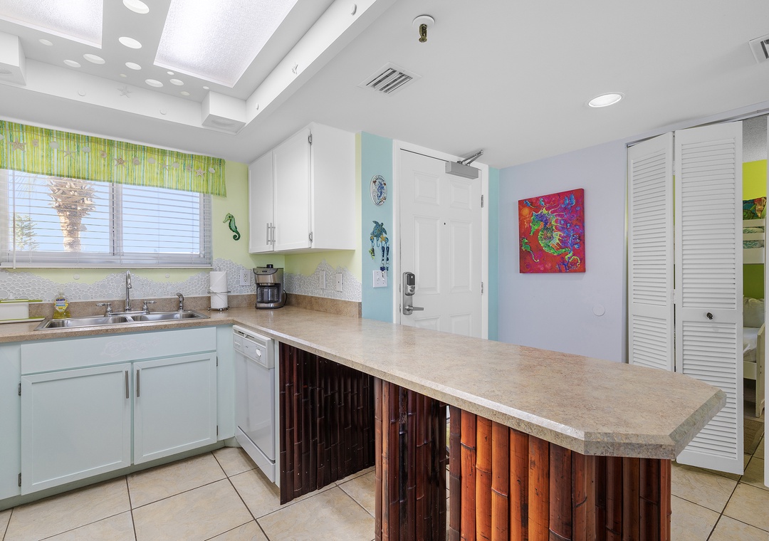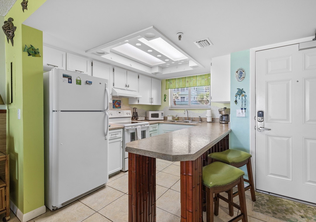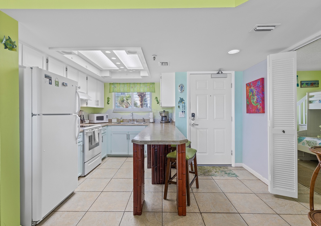 The foodies in your group will gravitate first to the kitchen. This space is composed of white appliances, white and teal cabinetry, and penny tile backsplash. Aside from its playful appeal, the kitchen is functional and fully stocked with a drip coffee maker, blender, toaster, pots and pans, and more. Meals can either be served at the breakfast bar for two or the dining table for four.