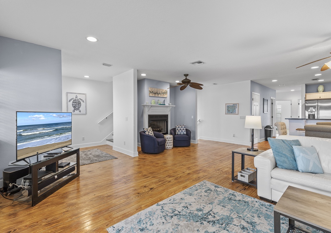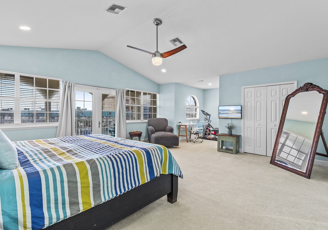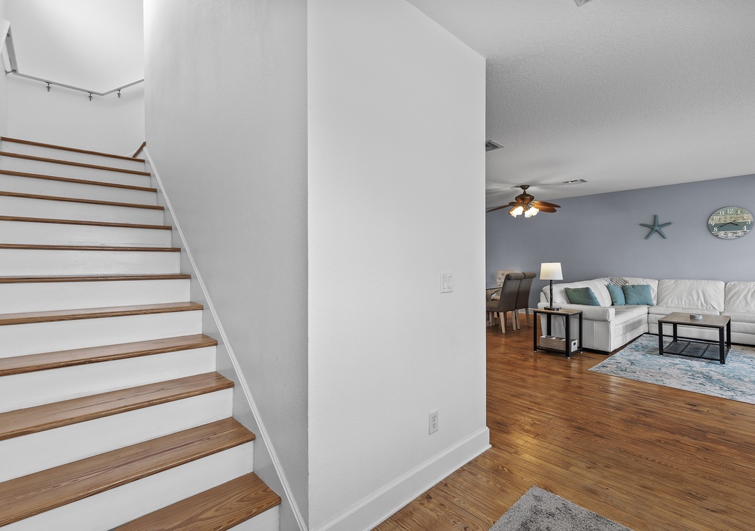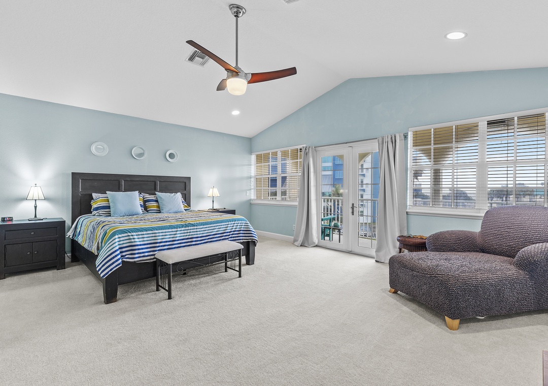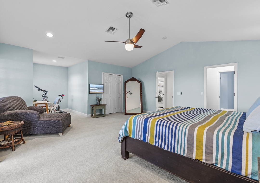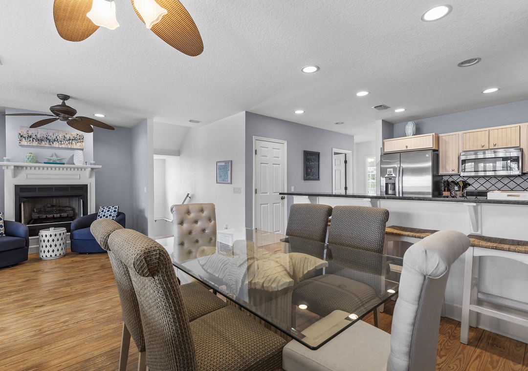 The townhome features spacious living areas, a well-equipped kitchen, and a game room with a pool table and Smart TV. The backyard oasis includes a pool, and plenty of lounging options, all surrounded by lush greenery. Upstairs, the primary suite boasts an ocean-view balcony, a luxurious bathroom, and a small exercise area, while other rooms provide comfortable accommodations for the whole family. Whether enjoying the beach or the backyard, Ocean's Edge guarantees an unforgettable experience.