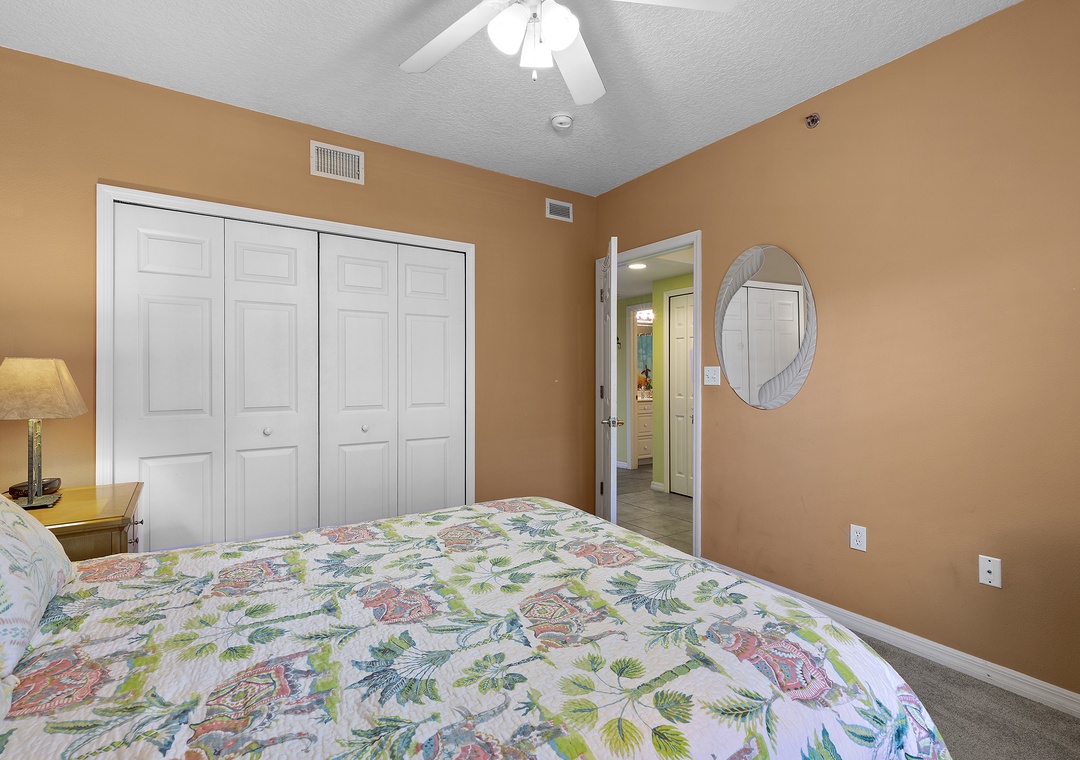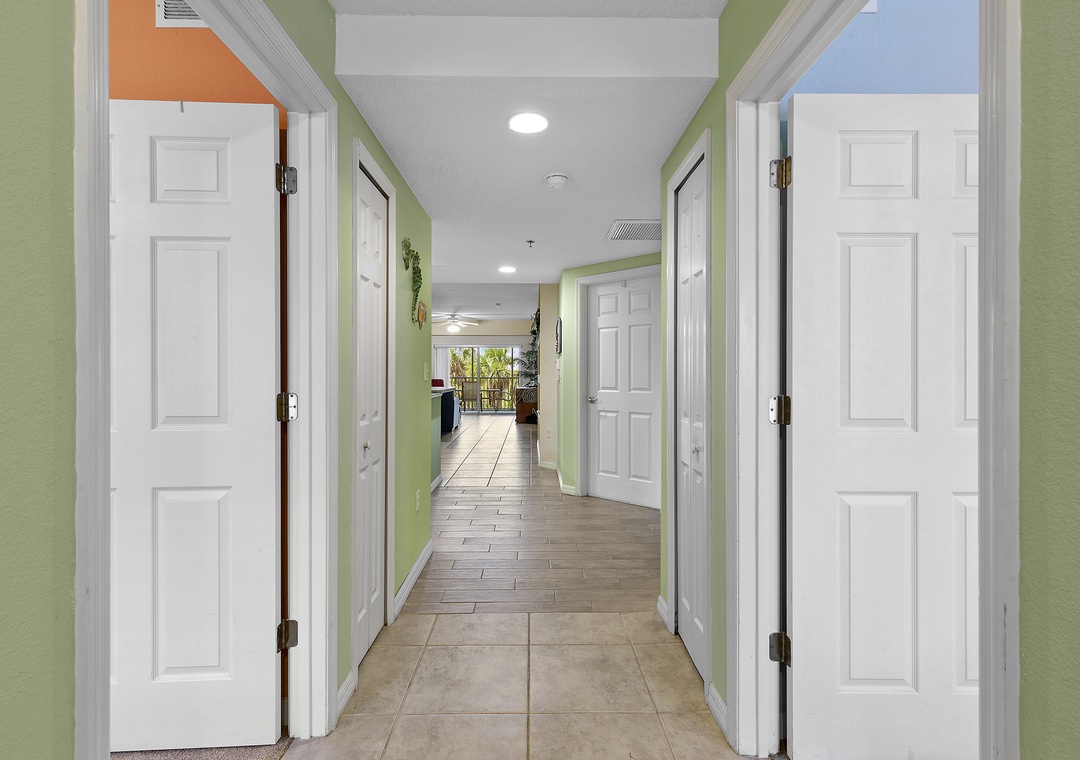 The master bedroom features a luxurious king bed, perfect for unwinding after a day in the sun. The guest bedroom includes a cozy queen bed, while the third bedroom has two twin beds — ideal for kids or additional guests.