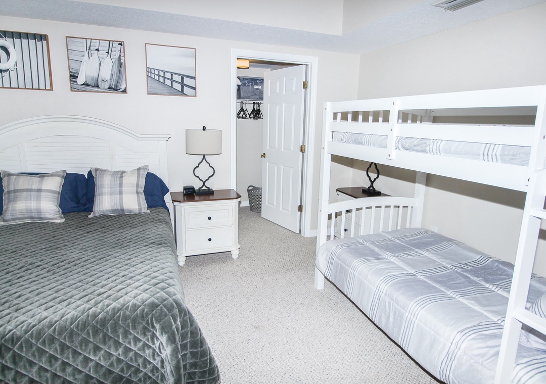 Retire to one of the two bedrooms after a day of beach adventures, with the primary bedroom featuring a king bed and an attached bathroom, while the second bedroom offers a queen bed and bunk beds. This condo is thoughtfully stocked with amenities like linens, towels, beach chairs, and entertainment options including cable TV, streaming services, and board games. Additional conveniences such as WiFi, a washer/dryer, and beach gear like umbrellas and toys ensure a comfortable and enjoyable stay for all guests.