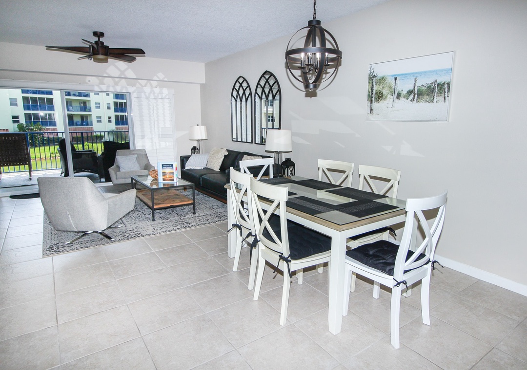 Escape to Oceanwalk 11-202 for an unforgettable New Smyrna Beach getaway! This 2-bedroom, 2-bathroom condo offers easy beach access and accommodates up to 6 guests, making it ideal for family vacations. Step into the inviting living area, adorned with light walls, cozy furnishings, and sliding glass doors leading to a sunny balcony where you can soak up the Florida sun. The fully equipped kitchen boasts white cabinetry, stainless steel appliances, and granite countertops, providing everything needed for convenient meal preparation, including a Keurig machine for coffee enthusiasts. Enjoy family meals at the dining table for 6 or light bites at the breakfast bar for 2.
