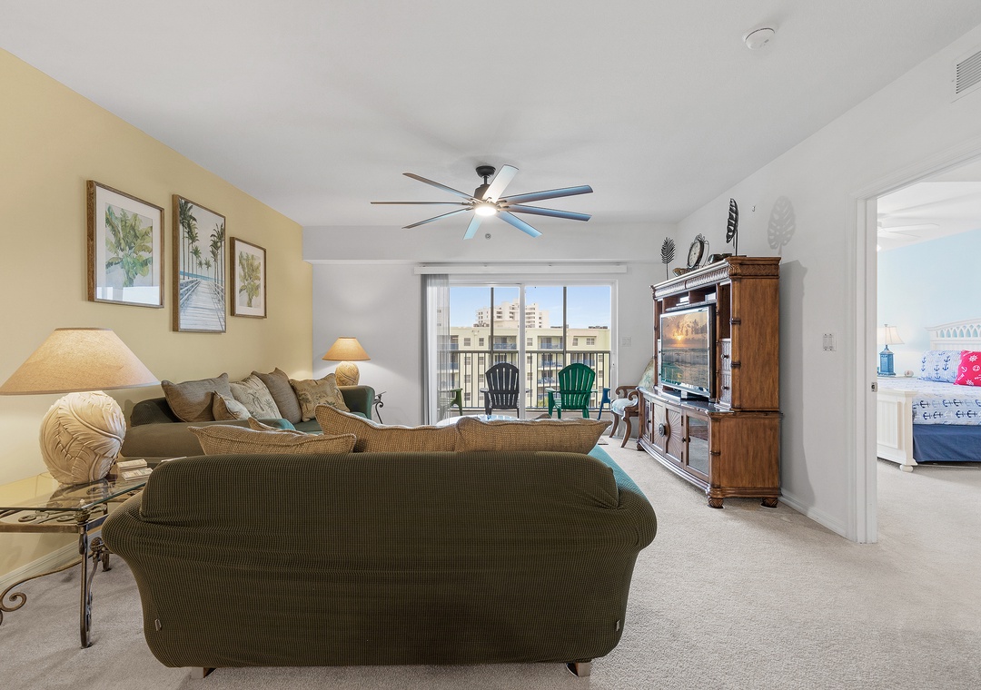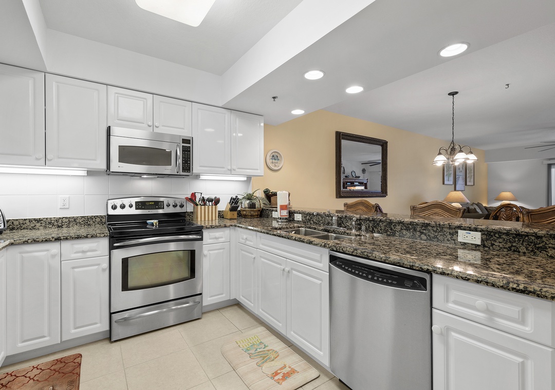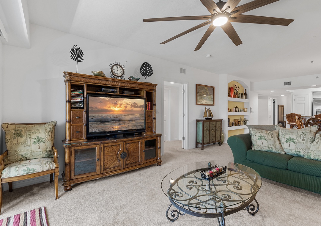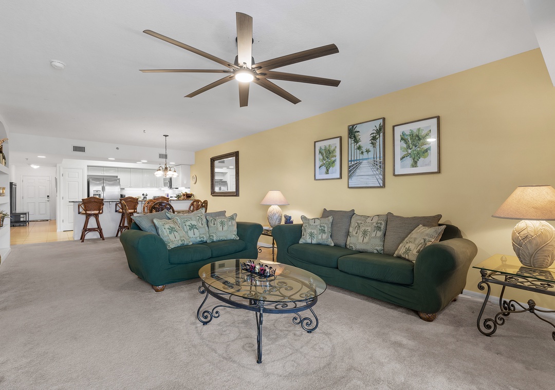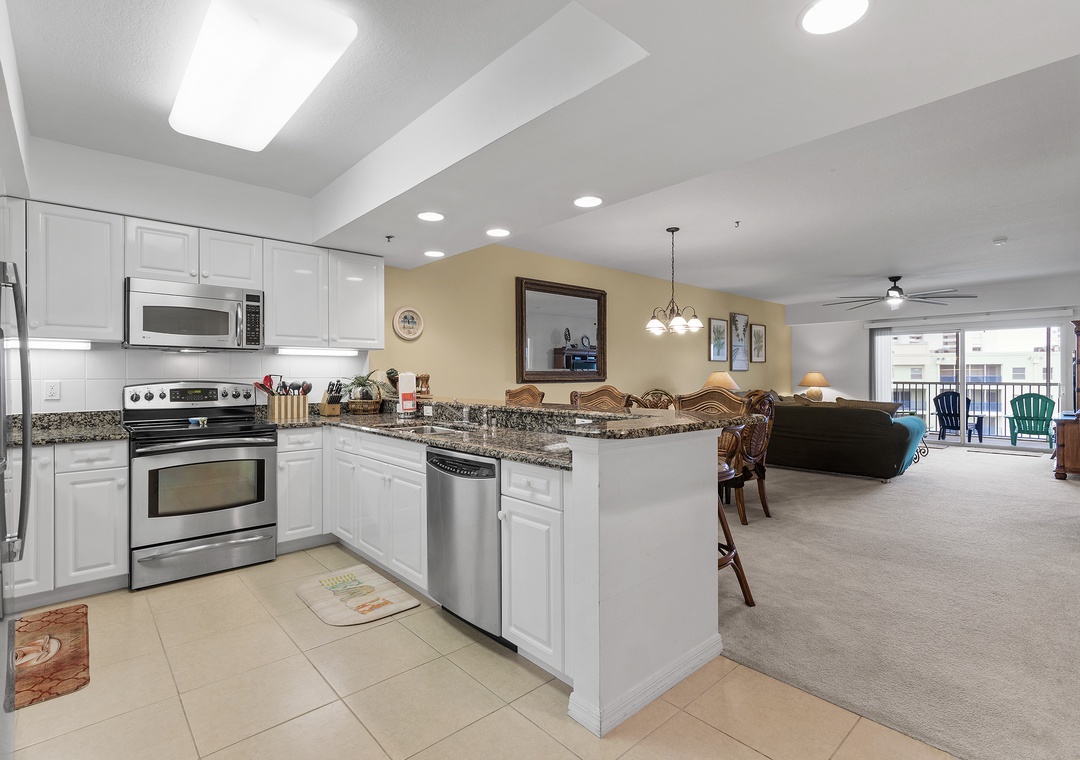 The fully equipped kitchen features everything you need to prepare meals at home, including full-size appliances, cookware, and ample counter space. Adjacent to the kitchen, the spacious living room offers comfortable seating and a welcoming area to unwind after a day in the sun.