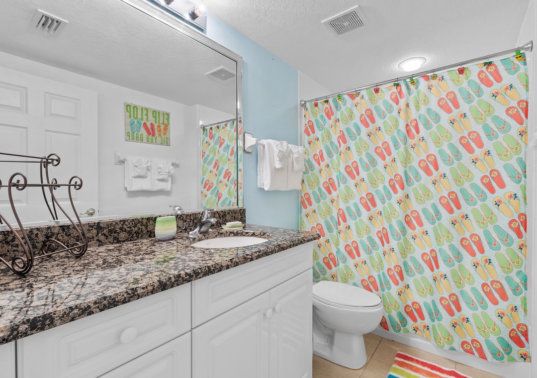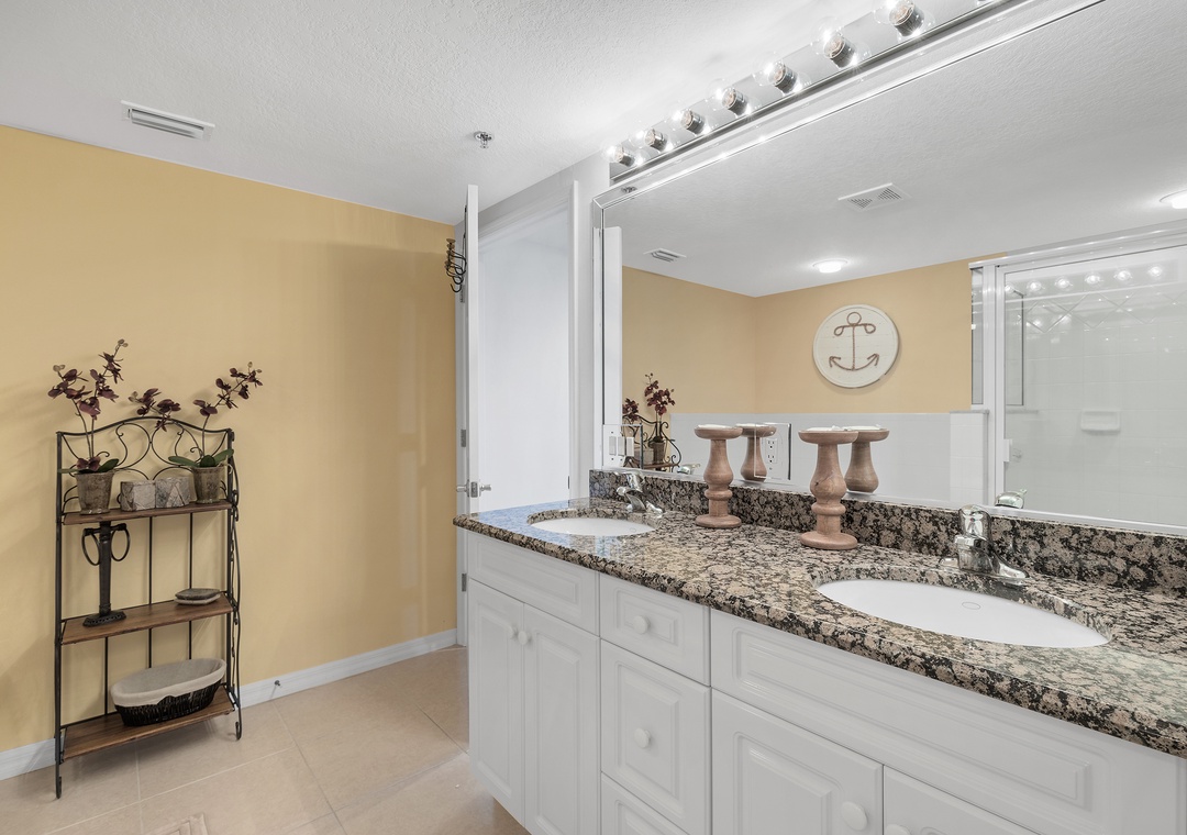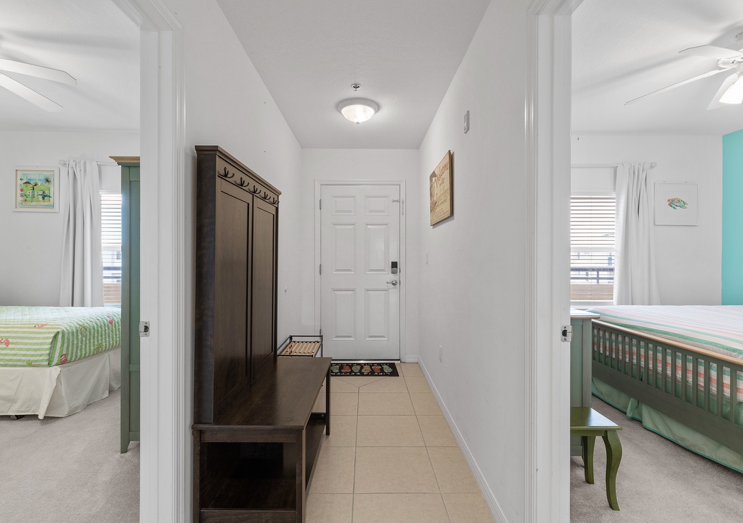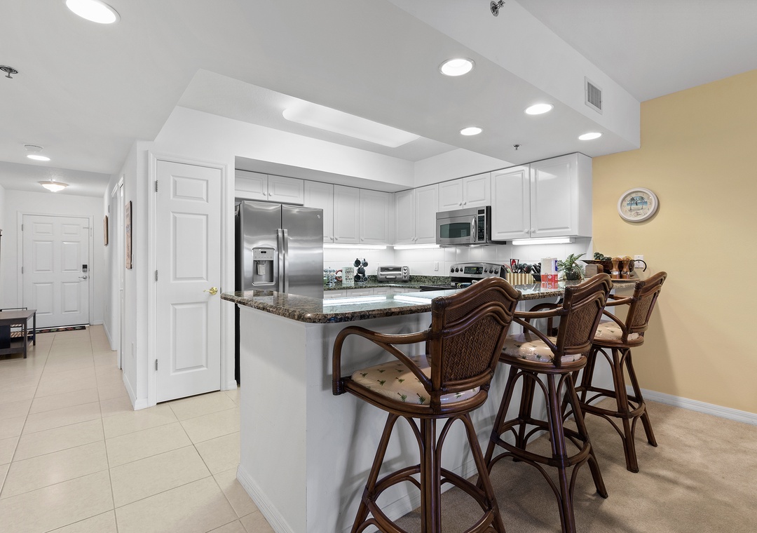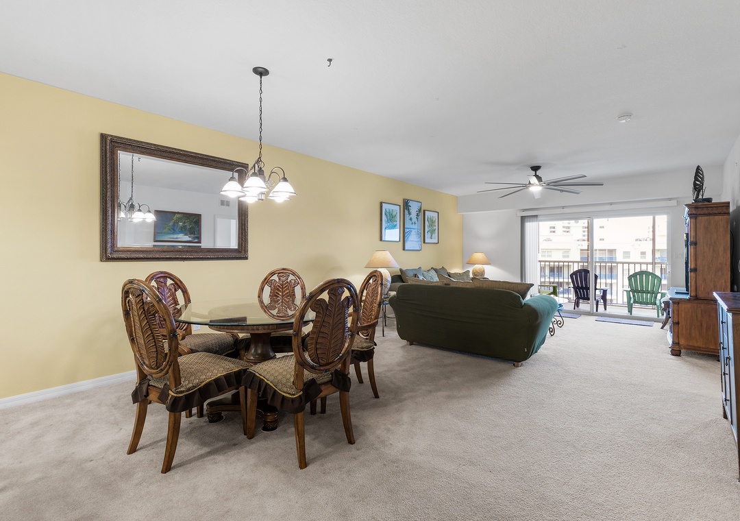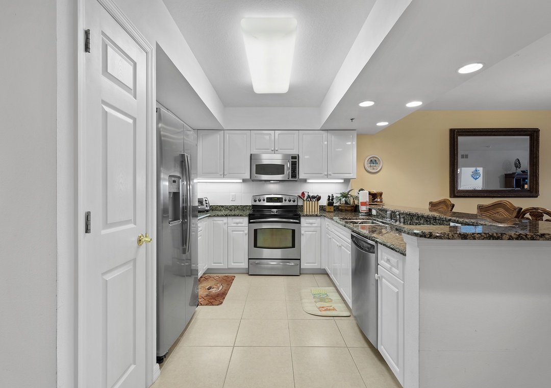 The fully equipped kitchen features everything you need to prepare meals at home, including full-size appliances, cookware, and ample counter space. Adjacent to the kitchen, the spacious living room offers comfortable seating and a welcoming area to unwind after a day in the sun.