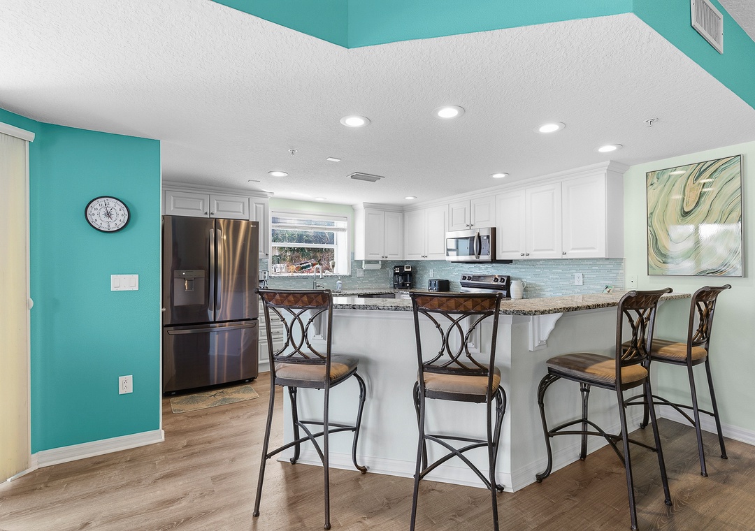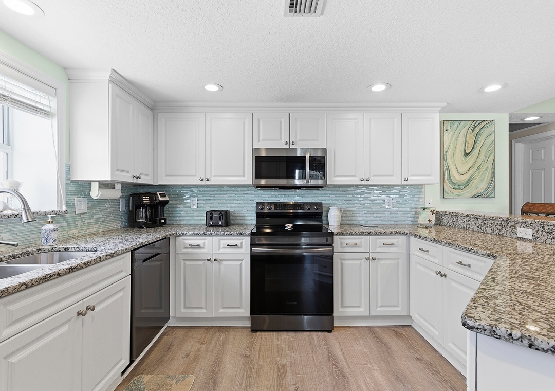 The stunning white kitchen is fully equipped with all the essentials you need to prepare a gourmet dinner or hosting a special evening meal. The bartop dining allows for pleasant conversations while whipping up a lovely meal.