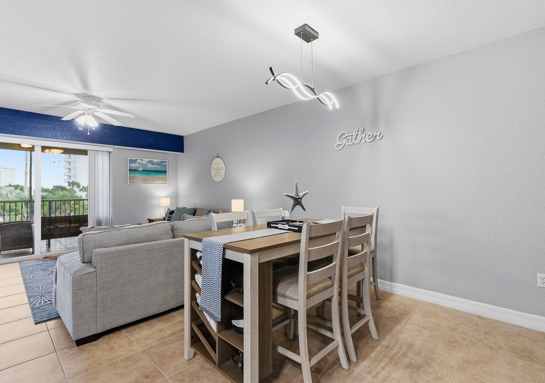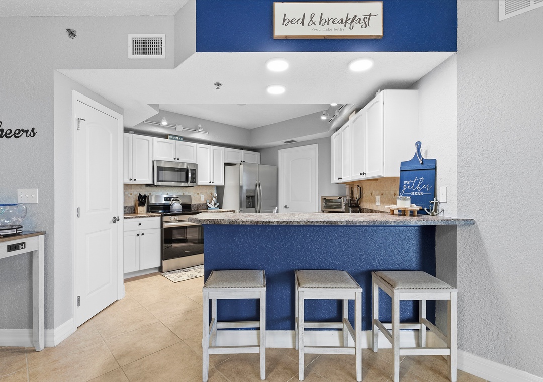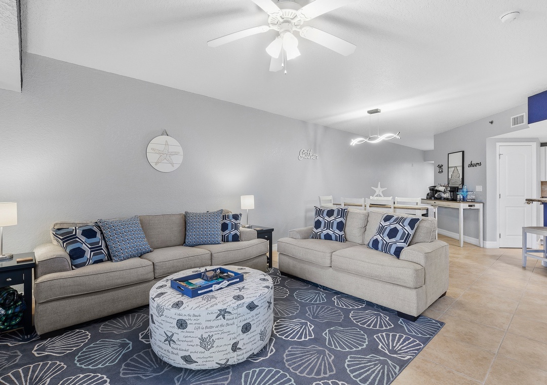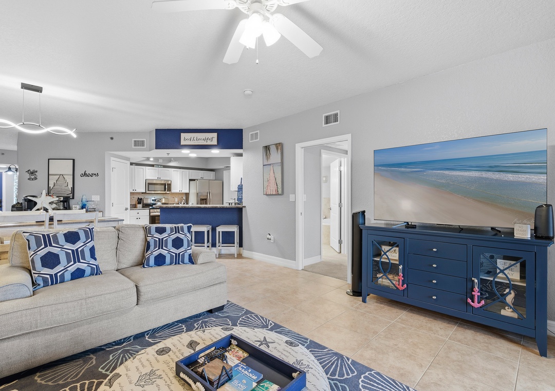 Welcome to Oceanwalk 12-302! This condo offers guests an inviting vacation stay in this two-bedroom, two-bathroom condo and treats your family to a pampered beach escape. Cool colors of coastal blues and grays blend wondrously with warm whites and tans creating the perfect blend of color palate for a coastal retreat. Soft and inviting bedding, plus a welcome coffee greeting station says this condo owner wants you to feel right at home and be treated with luxury.