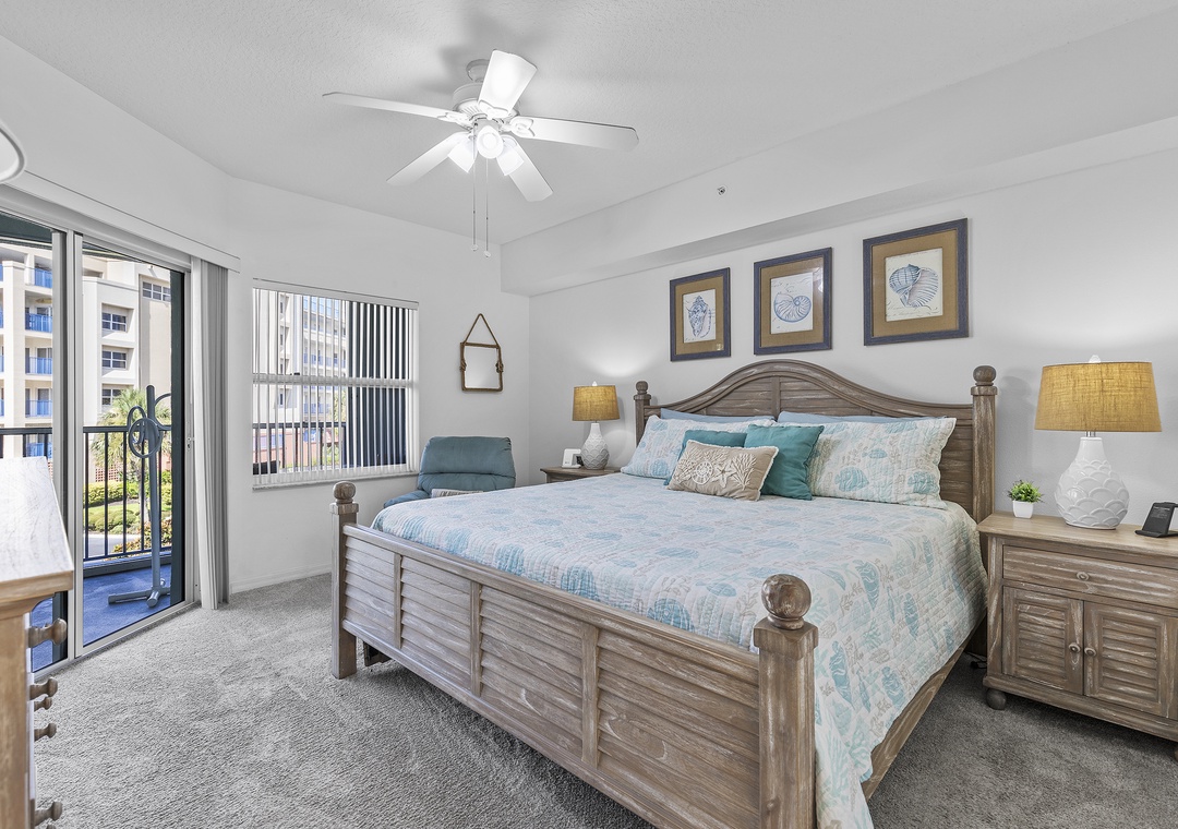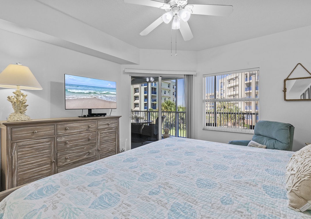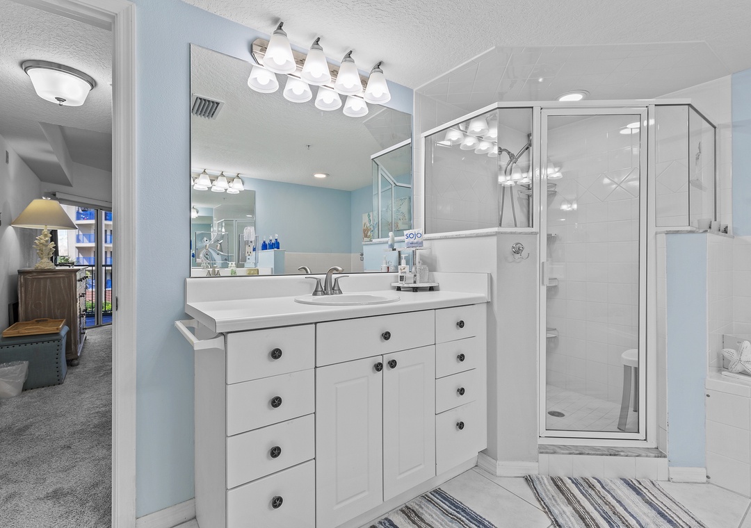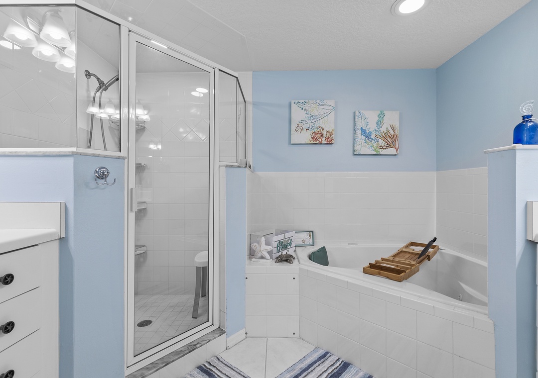 When you're ready for bed, say your goodnights and retire to the primary bedroom. Guests are provided with a king bed, Smart TV, recliner, and private balcony access. Your nighttime routine will be elevated thanks to the adjoining bathroom that boasts of a jacuzzi bathtub, shower, and his-and-hers vanities.