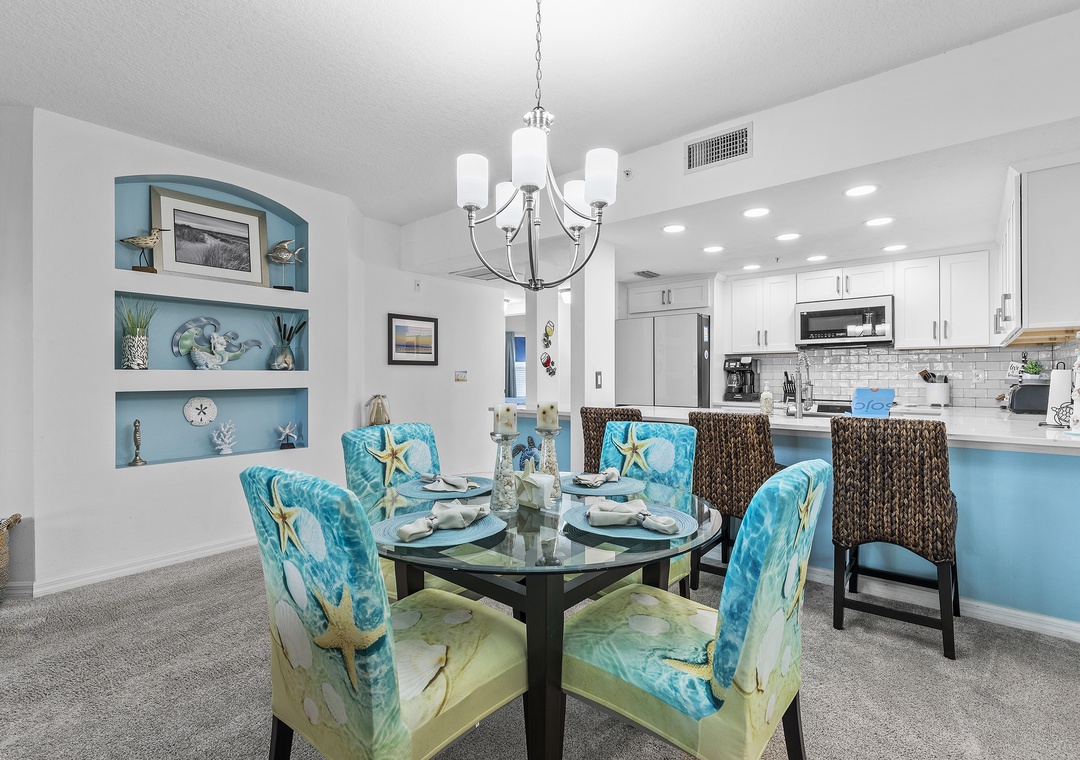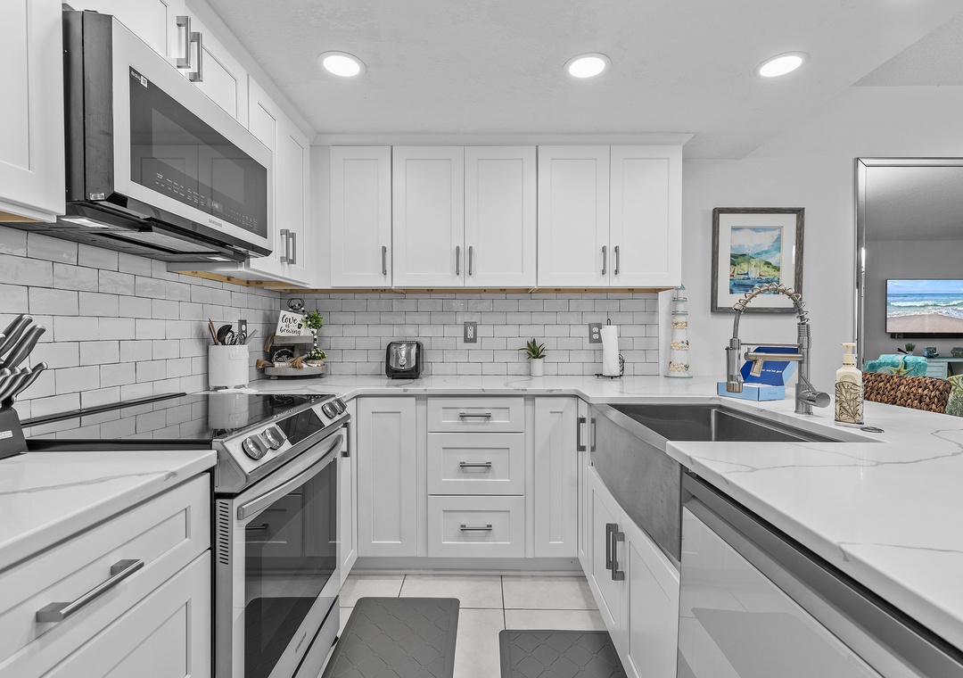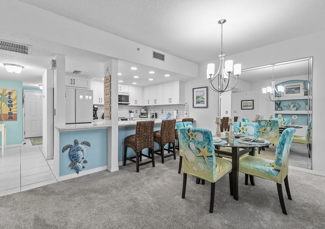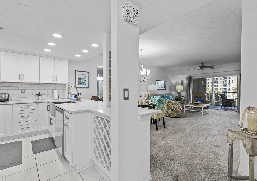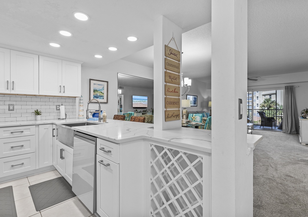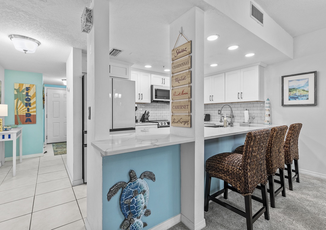 Start your tour in the updated kitchen. This space has white cabinetry and appliances, subway tile backsplash, and marbled countertops. Although you'll be drawn to the kitchen for its aesthetic, you'll find it equipped with essentials. Cookware, dinnerware, a drip/Keurig coffee maker, toaster, crockpot, blender, and more are provided. Bring a few bottles of your favorite wine and keep them in the kitchen's wine rack! When you're ready to eat, you can either snack at the breakfast bar for two or dine at the table for four.