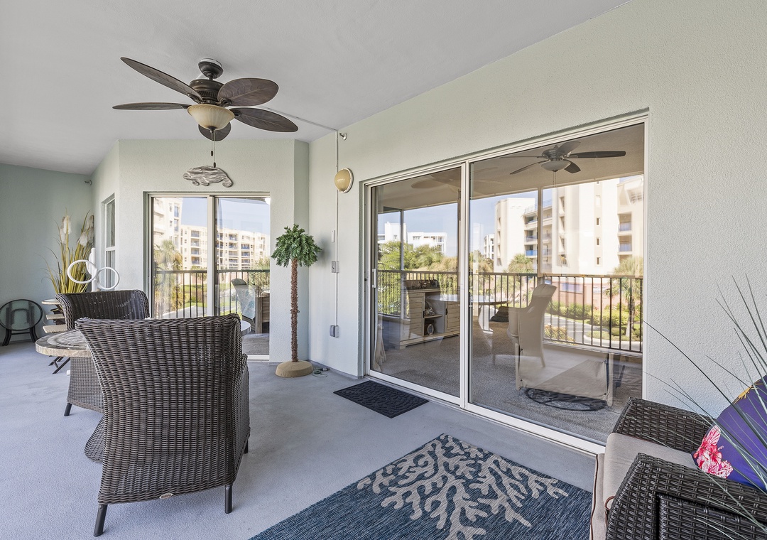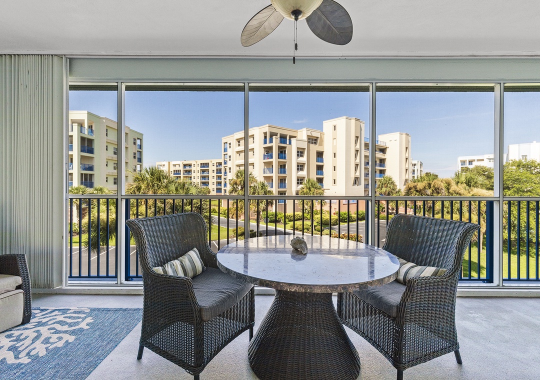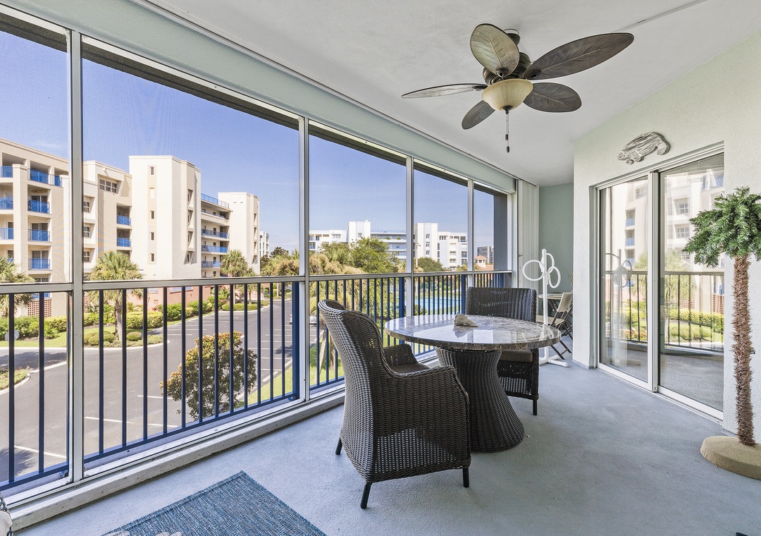 If you prefer outdoor adventure onto the third-floor balcony. This space is furnished with a dining set and loungers so everyone can kick back. Thanks to the balcony screen, you'll be able to enjoy evenings outdoors. The balcony looks onto the complex grounds and tennis courts.