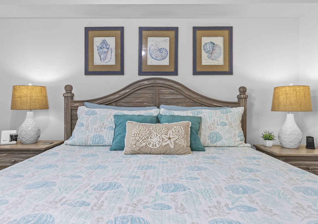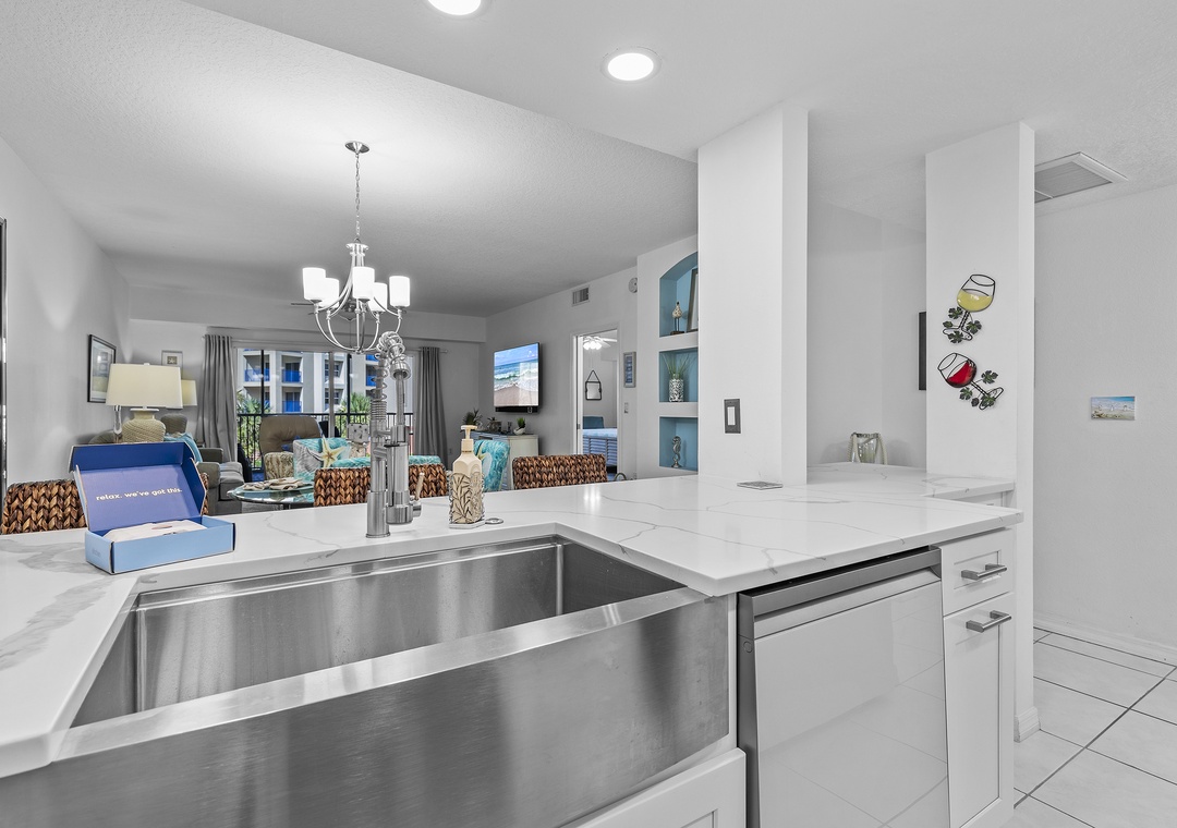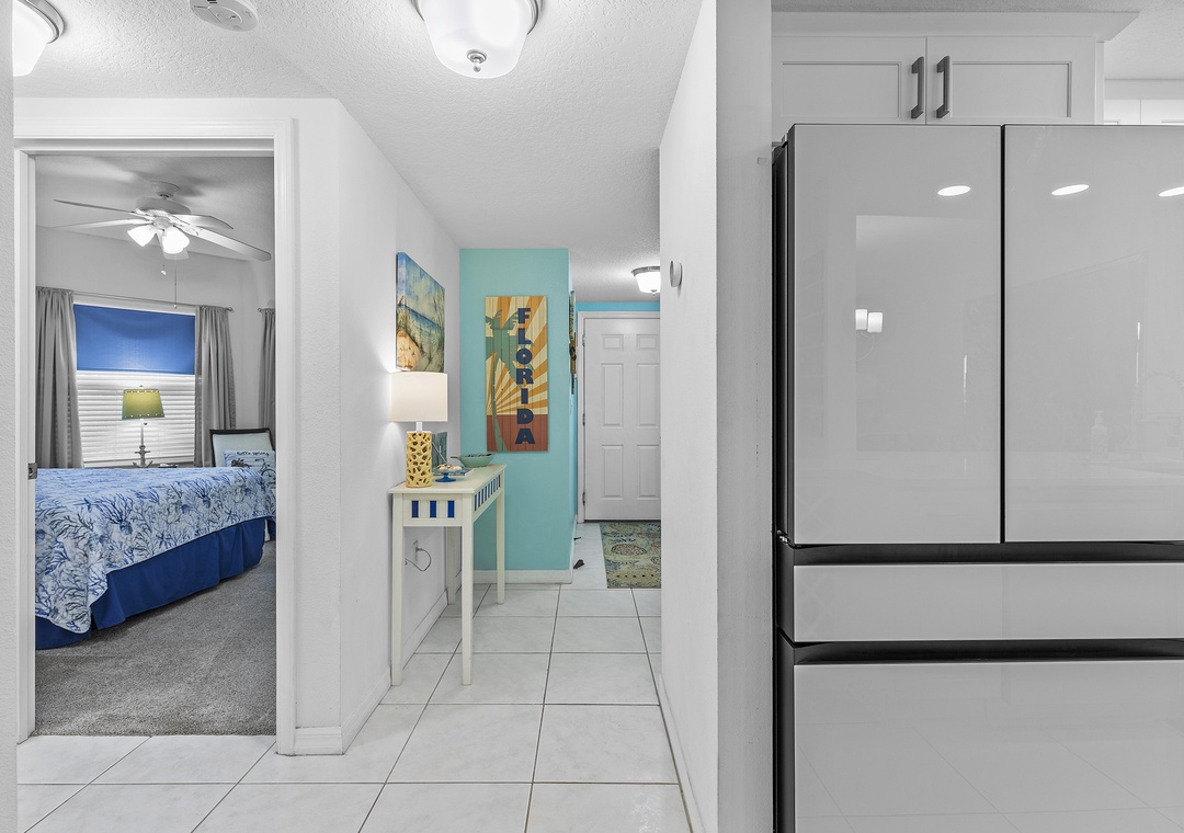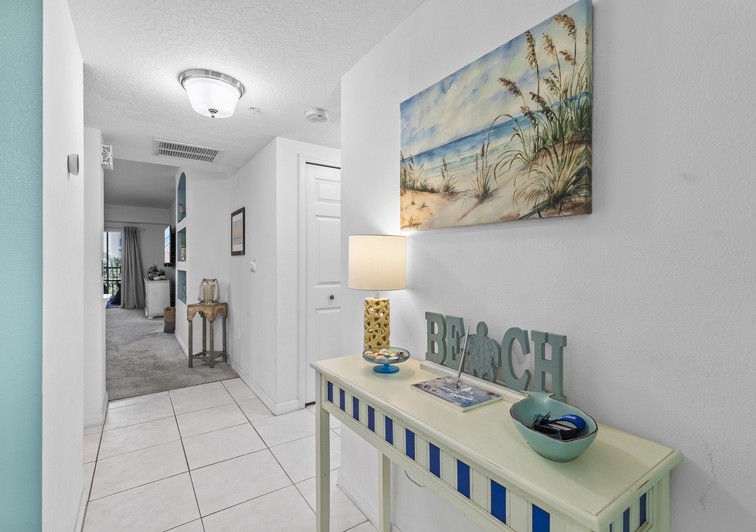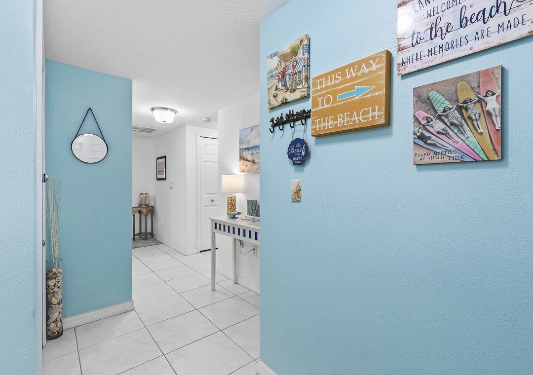 Before you walk into the condo, take in the gorgeous ocean view from the front door. This condo has one of the most convenient locations in the complex as it resides near the beach crosswalk. It's only a 5-minute walk from the sand! As you enter the getaway, you'll be greeted with a bright interior filled with teal accents.