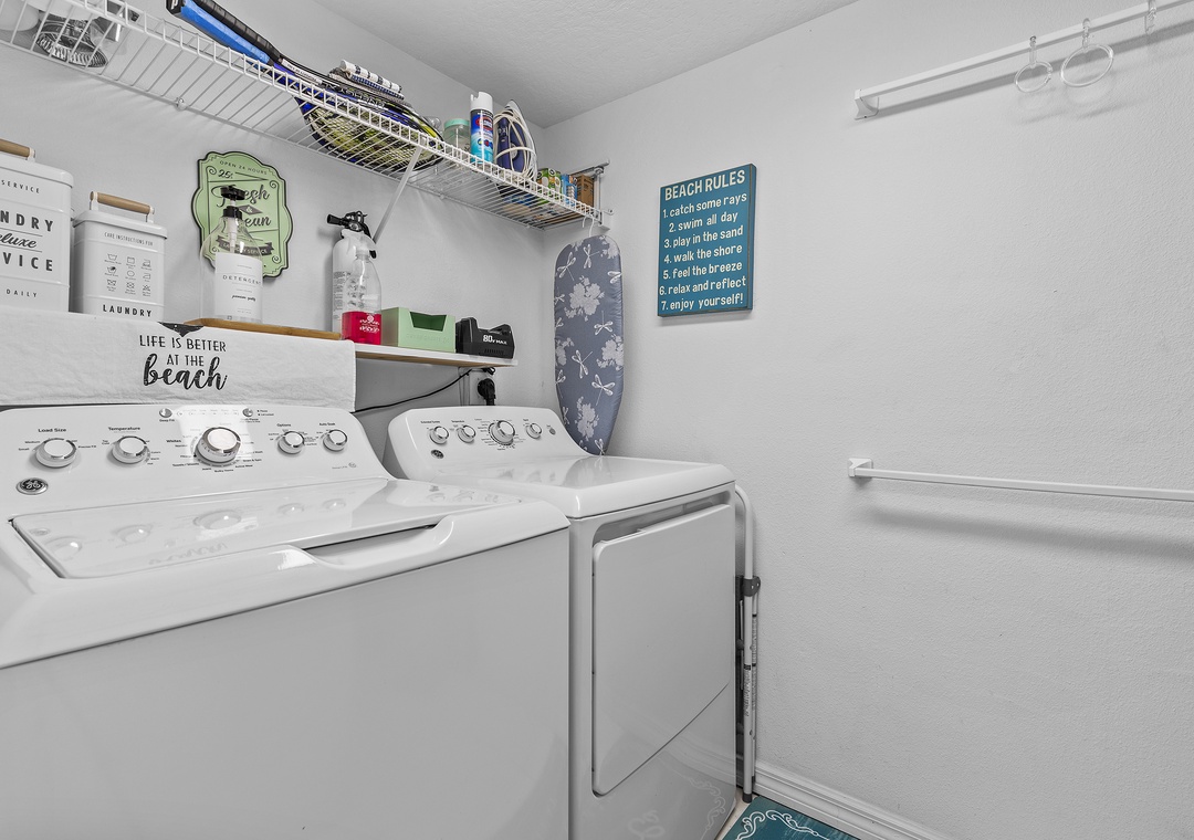 The condo is equipped with plenty of linens, towels, and all the conveniences of home to make your stay comfortable. There is cable, streaming service apps, WiFi, a DVD player, a drip/Keurig coffee maker, and a washer/dryer.
