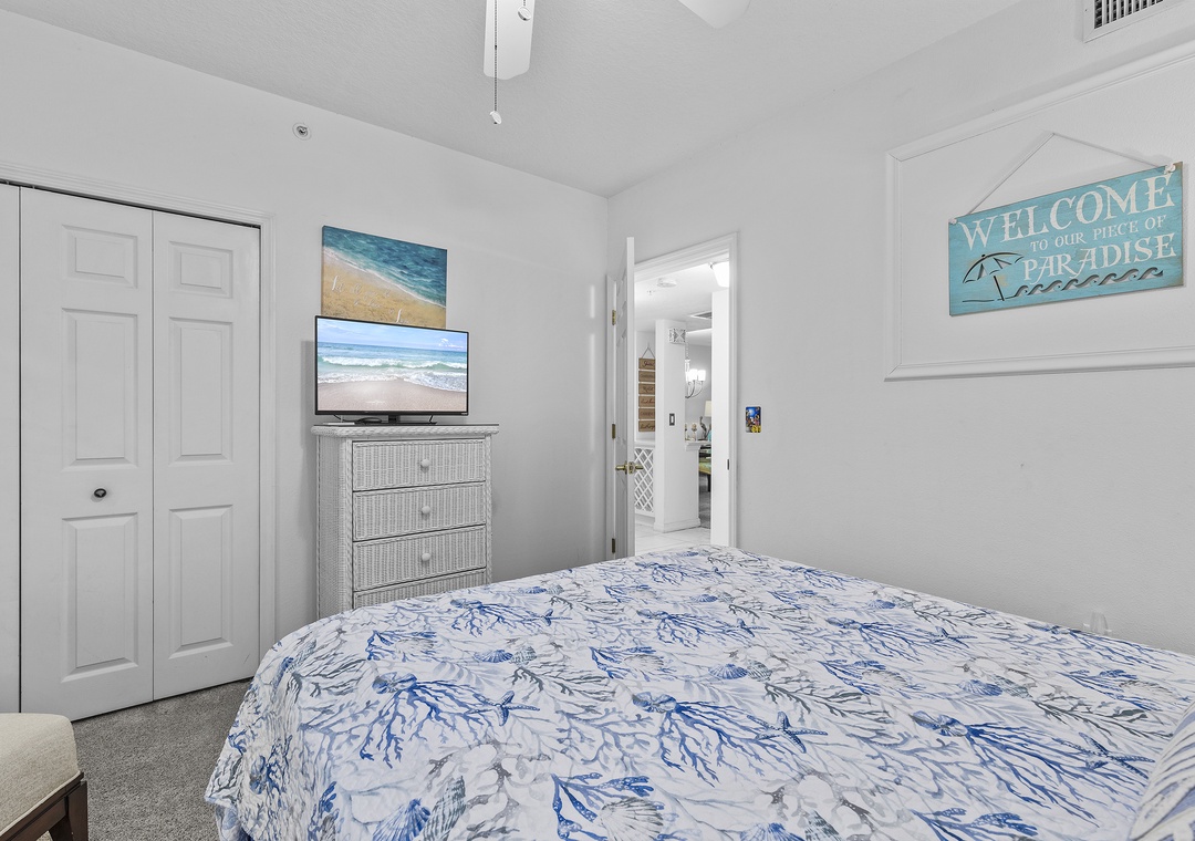 Two others can claim the second bedroom as their own. This bedroom provides a queen bed, TV, and chair. There's a nearby bathroom with a standard bathtub and a moveable showerhead.