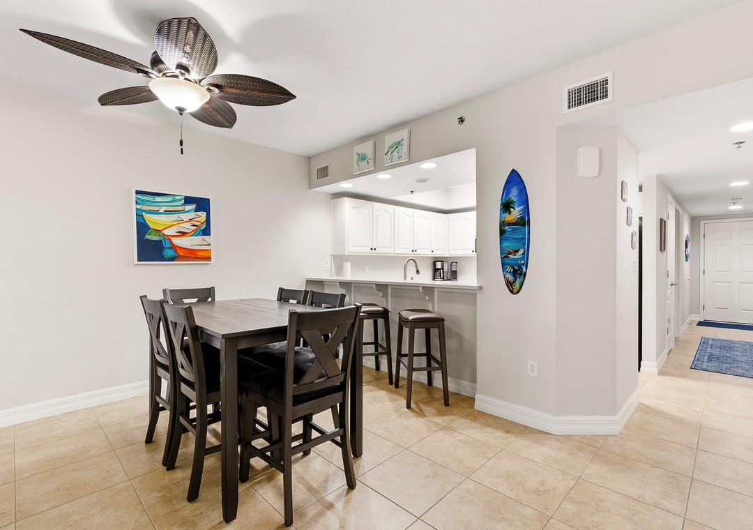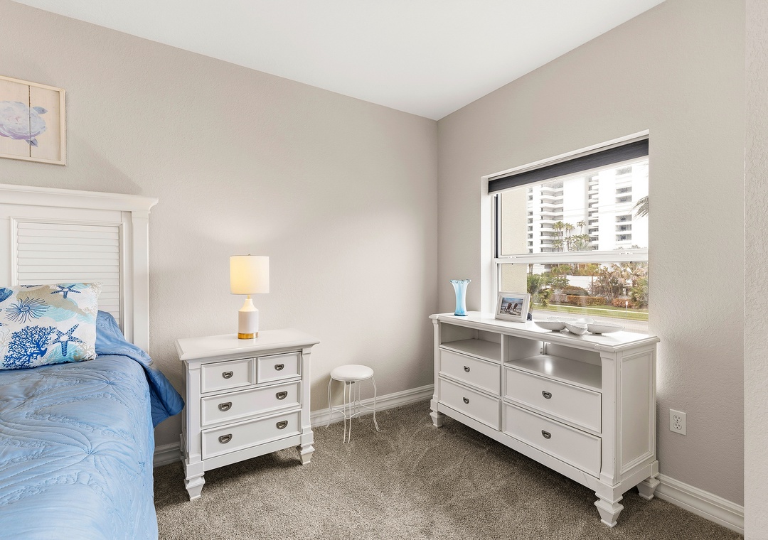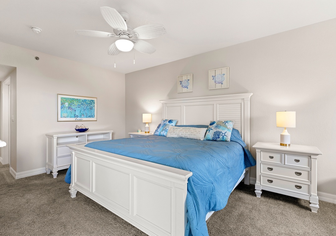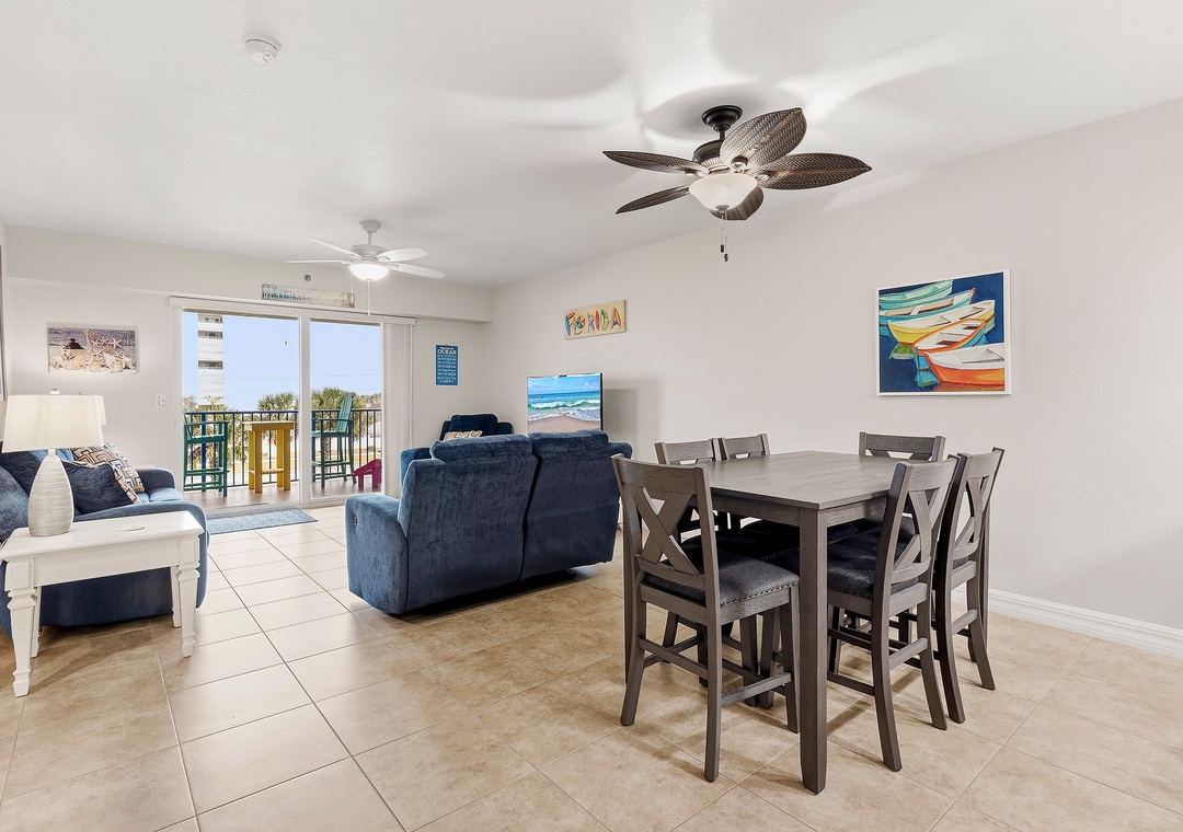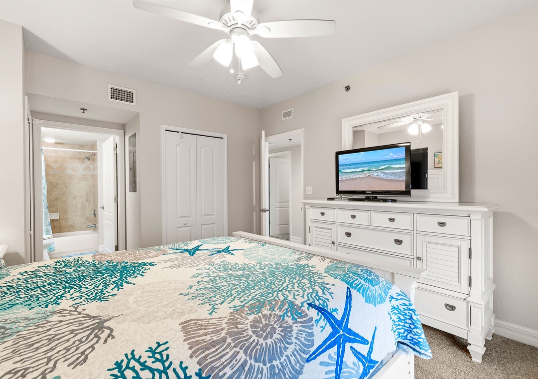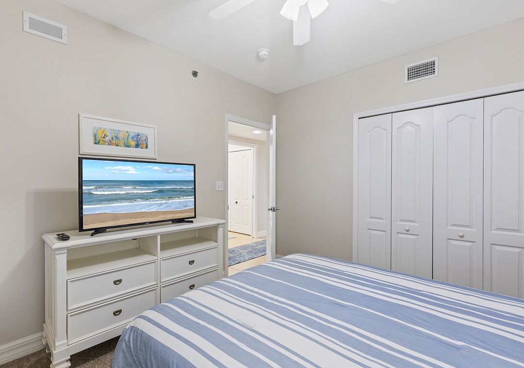 Oceanwalk 13-305 comfortably sleeps six in a high-end, coastal-inspired 3-bedroom, 2-bath condominium designed for gathering and relaxation. The spacious layout features a king bed in the primary suite with generous dresser space and private balcony access, a queen bed in the second bedroom, and a full-size bed in the third, all styled in bright, beachy tones. Guests will enjoy thoughtful touches like an oversized soaking tub, a welcoming open living environment, a rare peek of the Atlantic Ocean, and an easy short walk to the beach — making this the perfect setting for a relaxing getaway or memorable family retreat.
