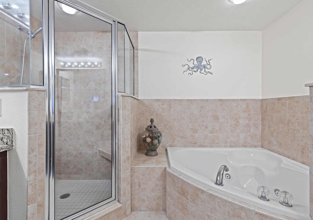 The primary bedroom features a beautiful spa tub and a spacious primary shower and walk in closet.