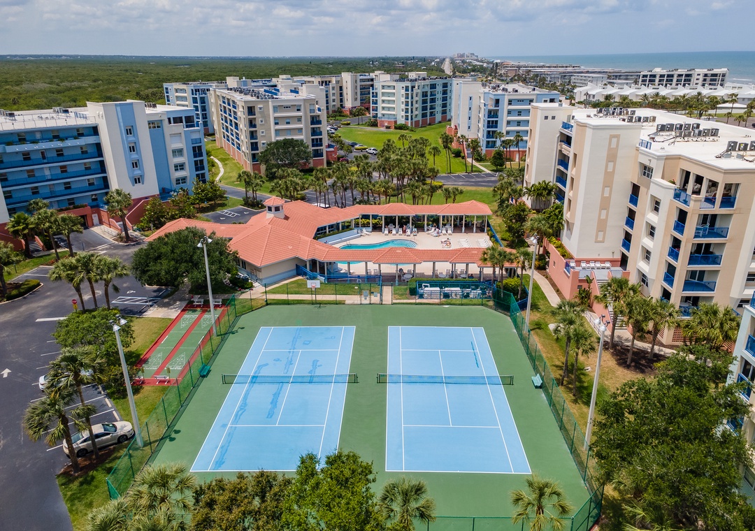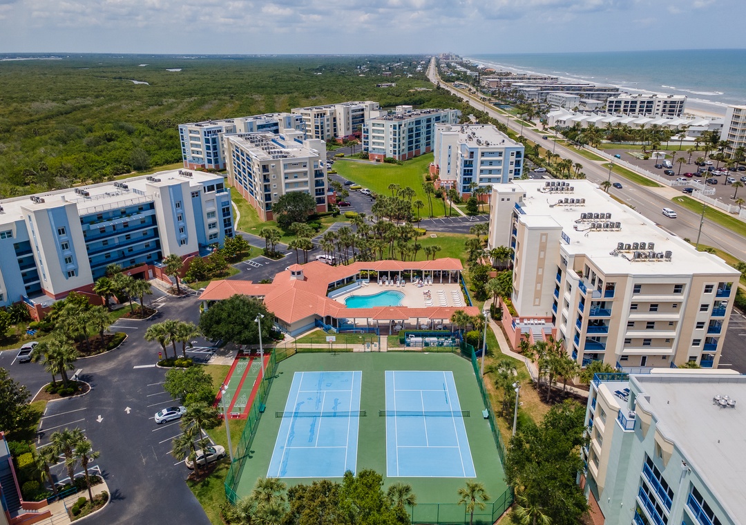 Oceanwalk Condominiums, well-regarded for their central location, large floor plans, and the finest amenities in New Smyrna, are located in the south beach area of New Smyrna Beach. The 20-building condo complex is located across the street from the beach and features up-to-date, king-size rooms in many different floor plans. These well-appointed condominiums boast wide balconies, spacious master bedrooms, big guest bedrooms, a deluxe master bathroom, a living room, a dining room, a kitchen, a laundry room, and more. Every one of the buildings has shared elevated sun decks on the first-floor level. Onsite amenities include an exercise room, saunas, two seasonally heated pools, a poolside spa, a bocce court, two tennis courts with lighting, two shuffleboard courts, a basketball hoop, a BBQ gas grill area, and two gorgeous clubhouses.