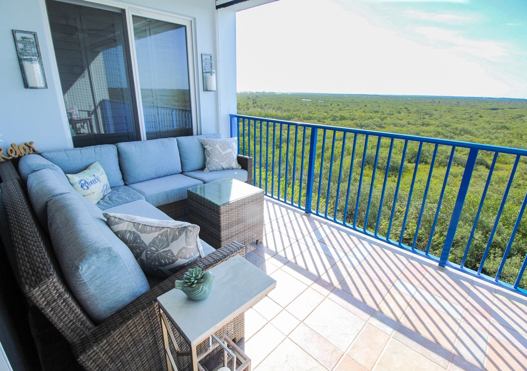 The primary bedroom is a large space with plush carpet and a king-size bed. The upscale matching bedroom furniture set allows for plenty of storage space. There is a TV located on the dresser across from the bed, so when you’re relaxing you can watch your favorite comfort show. In the corner, there is a seating area with a tropical blue accent chair. This is the perfect nook to read a good book, and if you forgot to bring one, there are a few provided. This bedroom also has access to the balcony where you can admire the gorgeous view.