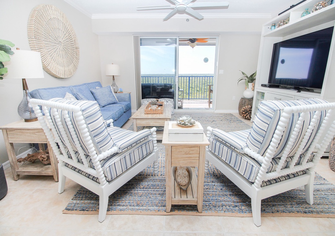 The living room is a large naturally lit space where you and yours can relax after a fun day in NSB. This space is tastefully decorated with coastal blue hues, natural fibers, and greenery. There is ample seating with the cozy blue sofa and two matching accent chairs. The jute rug and coastal décor bring the space to life and give a more inviting atmosphere. This space offers a large Smart TV for your stay. From the living room, there is access to the private balcony which is furnished with a cozy outdoor sectional and a high-top table with two chairs. It overlooks Florida’s expansive natural ecosystem and is the perfect spot to watch the incredible NSB sunsets or to have an unobstructed view of rocket launches from Cape Canaveral. Once you’re ready to head back inside, the open layout leads to the dining room.