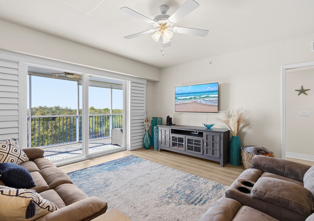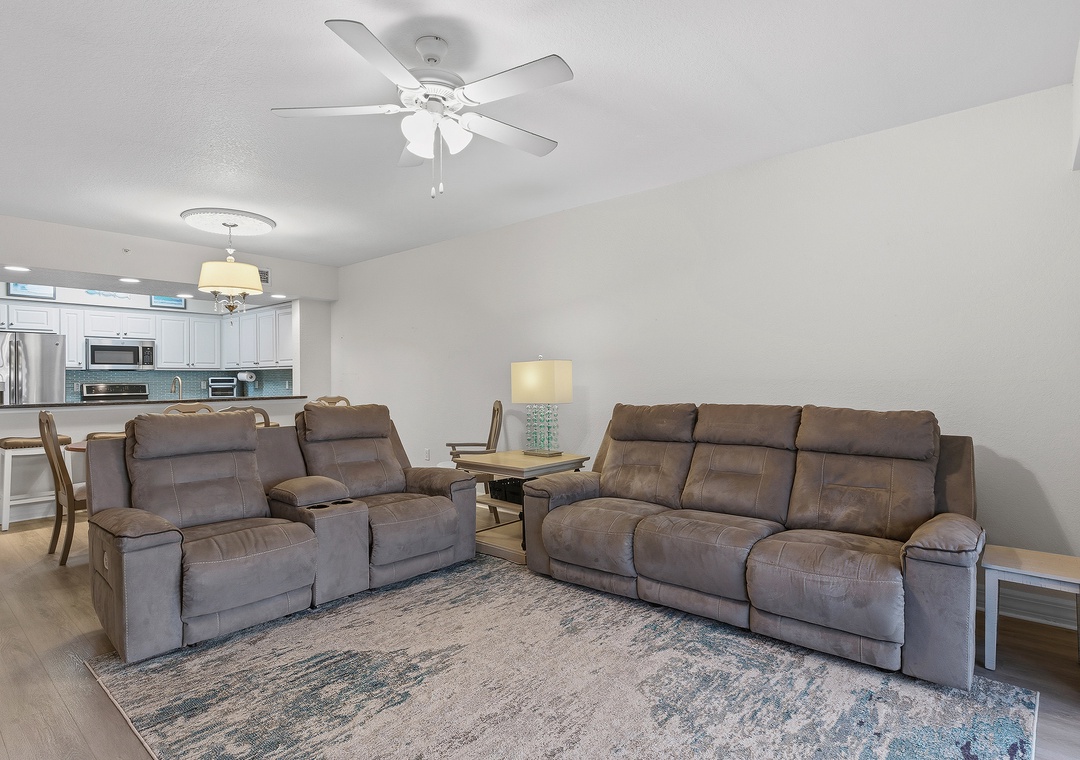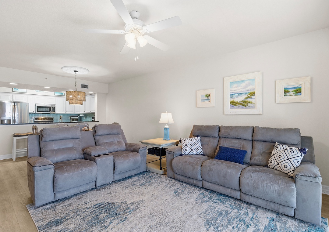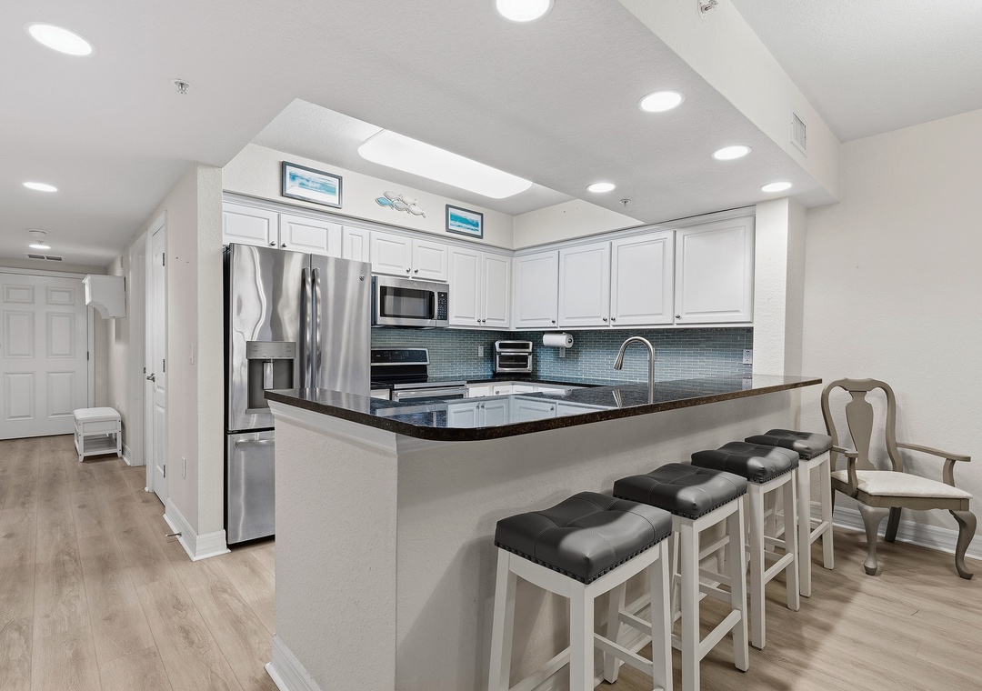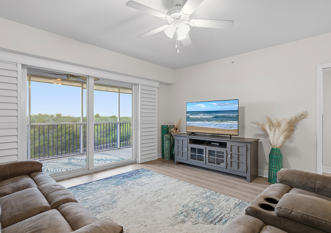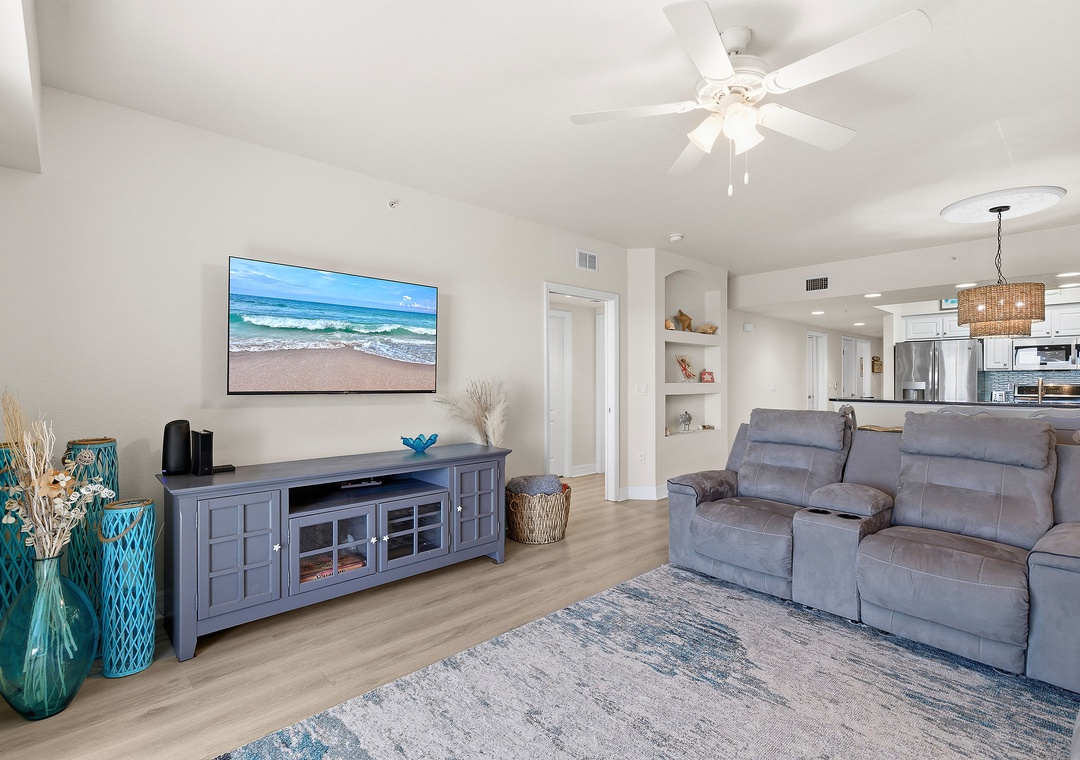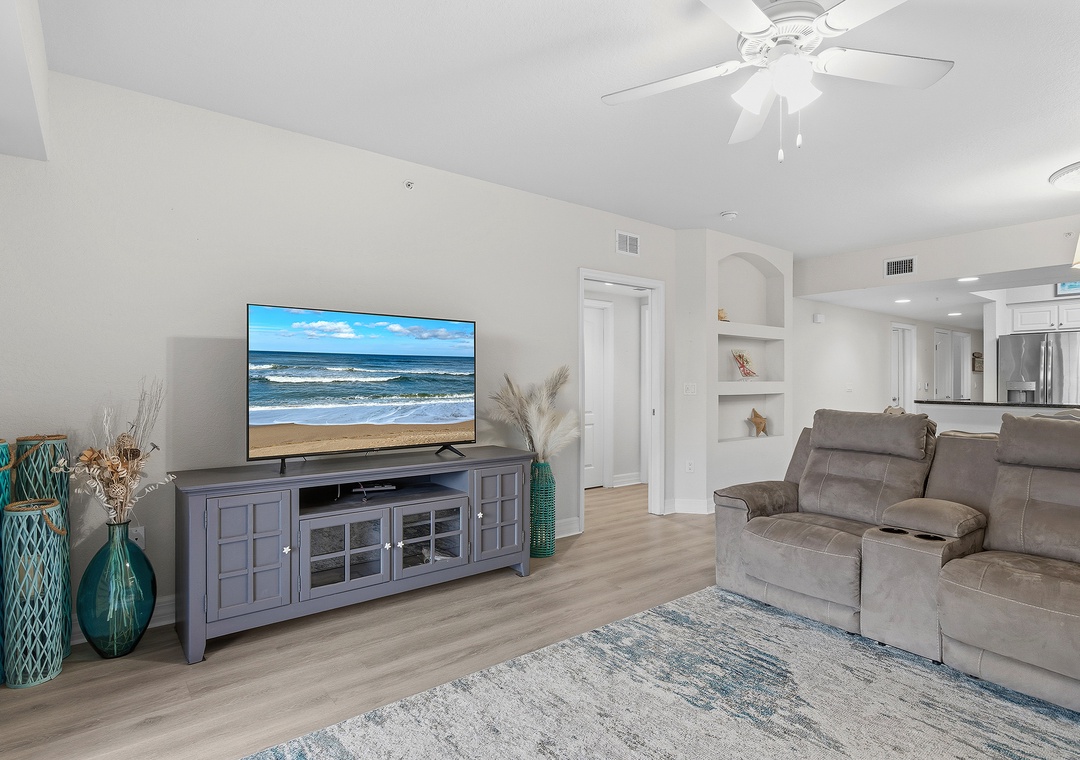 New Smyrna Beach is one of Florida’s best destinations for swimming, surfing, kite surfing, shore fishing, and family fun, but the real magic is coming home to a spacious, relaxing beachside condo like Oceanwalk 17-303. This 3-bedroom, 2-bath retreat blending stylish décor with cozy comfort, offering a beach escape you’ll want to revisit year after year. The modern kitchen features clean white cabinetry, stainless-steel appliances, and granite countertops, providing a beautiful space to cook while soaking in scenic views. Whether you’re enjoying breakfast at the bar, gathering around the dining table, or playing cards on the patio at sunset overlooking the estuary, there’s plenty of room for quality time. After a full day at the beach, settle into plush reclining couches and enjoy a movie night on the 55" Smart TV.