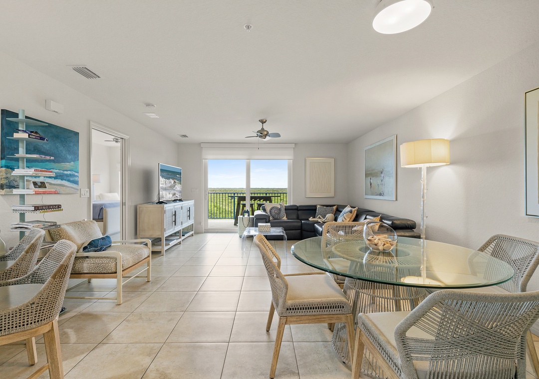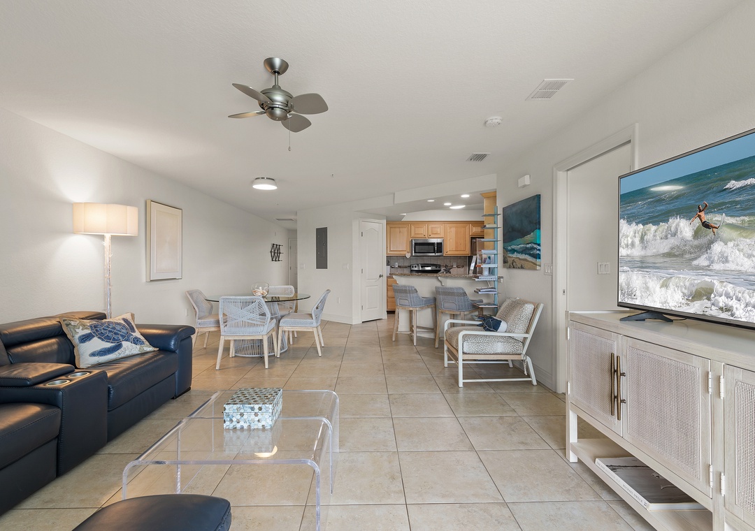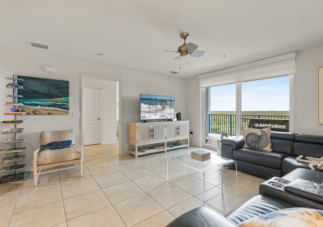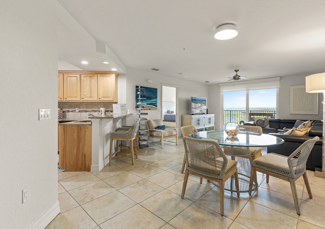 Come stay at Oceanwalk 17-502, a modern, high-end, hotel-chic condo that blends sleek furnishings, stylish décor, and cozy comfort for the perfect beach escape. This 2-bedroom, 2-bath retreat offers abundant natural light, cool-toned tile, and an open layout designed for family gatherings, from breakfast at the bar or dinner at the dining table to sunset card games on the patio overlooking the estuary. The kitchen features beechwood cabinetry, stainless steel appliances, and granite countertops, while the living area invites relaxation with a reclining couch and streaming-ready smart TV. The primary suite is a true sanctuary with a king bed, private balcony, Smart TV, and spa-like bathroom with a walk-in shower, double vanities, and jetted tub, while the guest bedroom—tucked on the opposite side of the condo—offers double bunk beds for four and ocean views. Step outside to take in breathtaking estuary scenery, enjoy amenities like Smart TVs in both rooms, beach chairs, a cooler, keyless entry, a washer/dryer, high-speed internet, and premium cable, and take advantage of the short two-minute walk across the safety crosswalk to the beach.