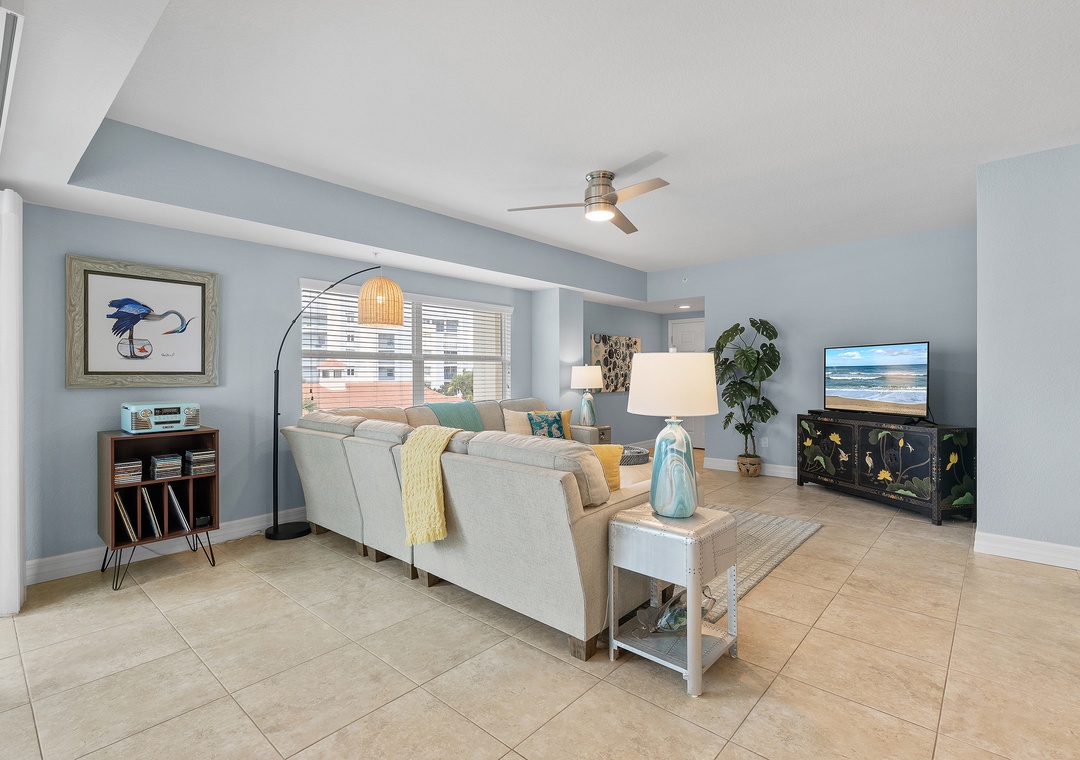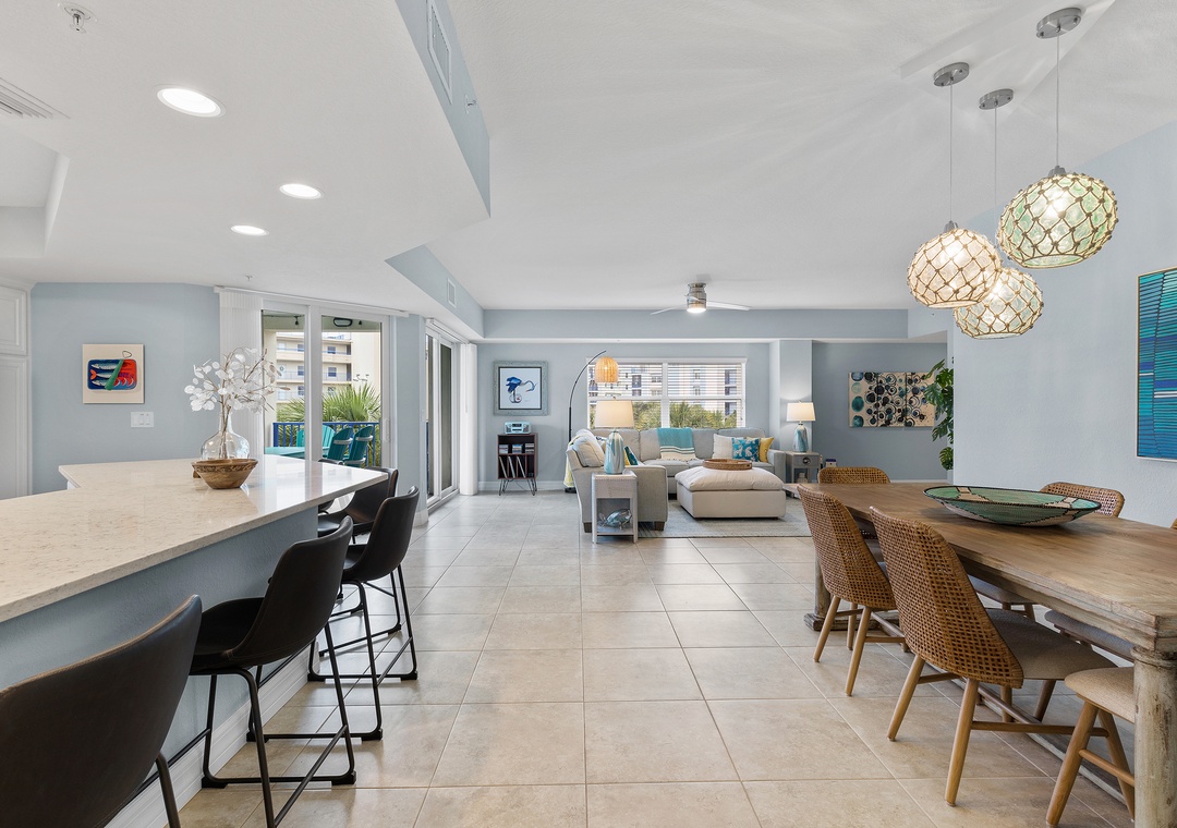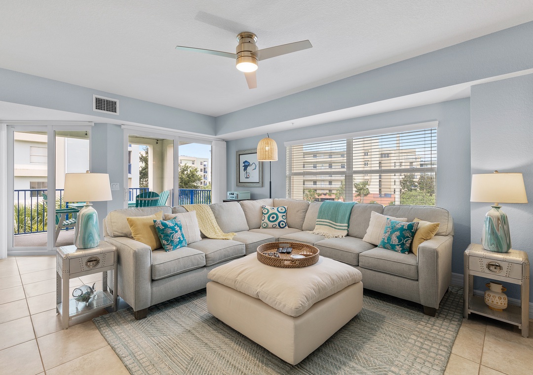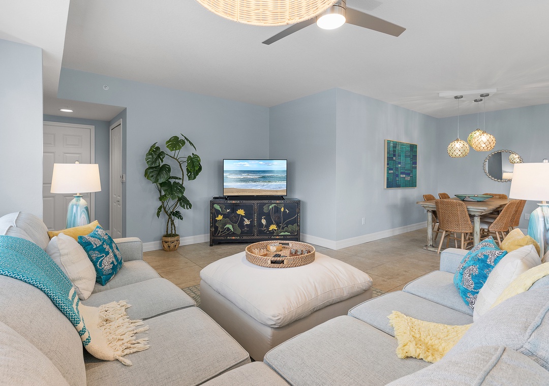 Welcome to Oceanwalk 20-307! Enjoy the best of coastal living in this beautifully maintained 3-bedroom, 2-bath condo located directly across the street from the beach. With plenty of natural light and an open floor plan, this inviting space is perfect for relaxing and reconnecting. The fully equipped kitchen features everything you need to prepare meals at home, including full-size appliances, cookware, and ample counter space. Adjacent to the kitchen, the spacious living room offers comfortable seating and a welcoming area to unwind after a day in the sun.