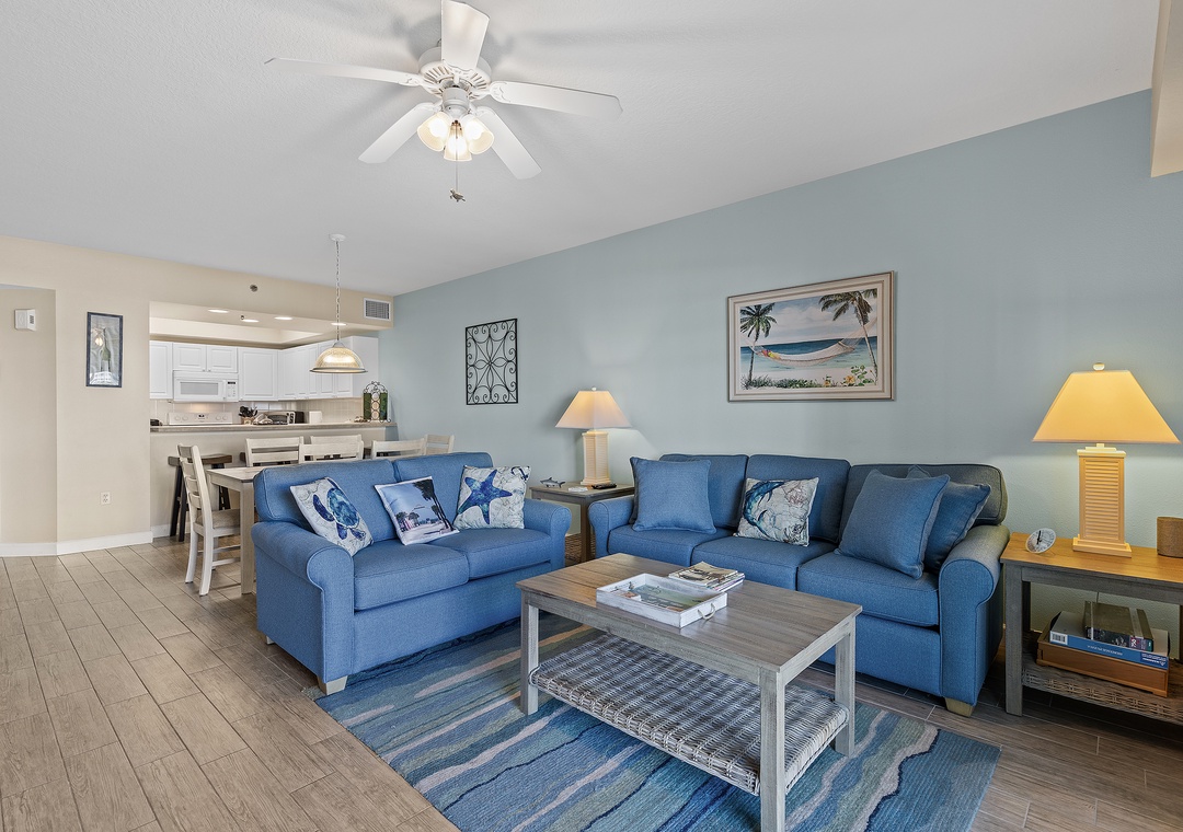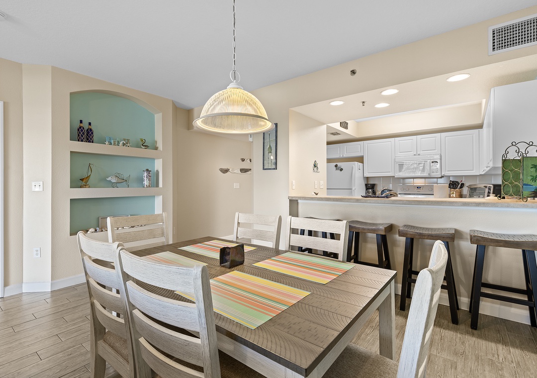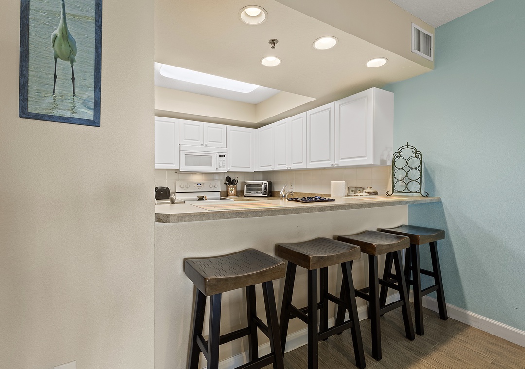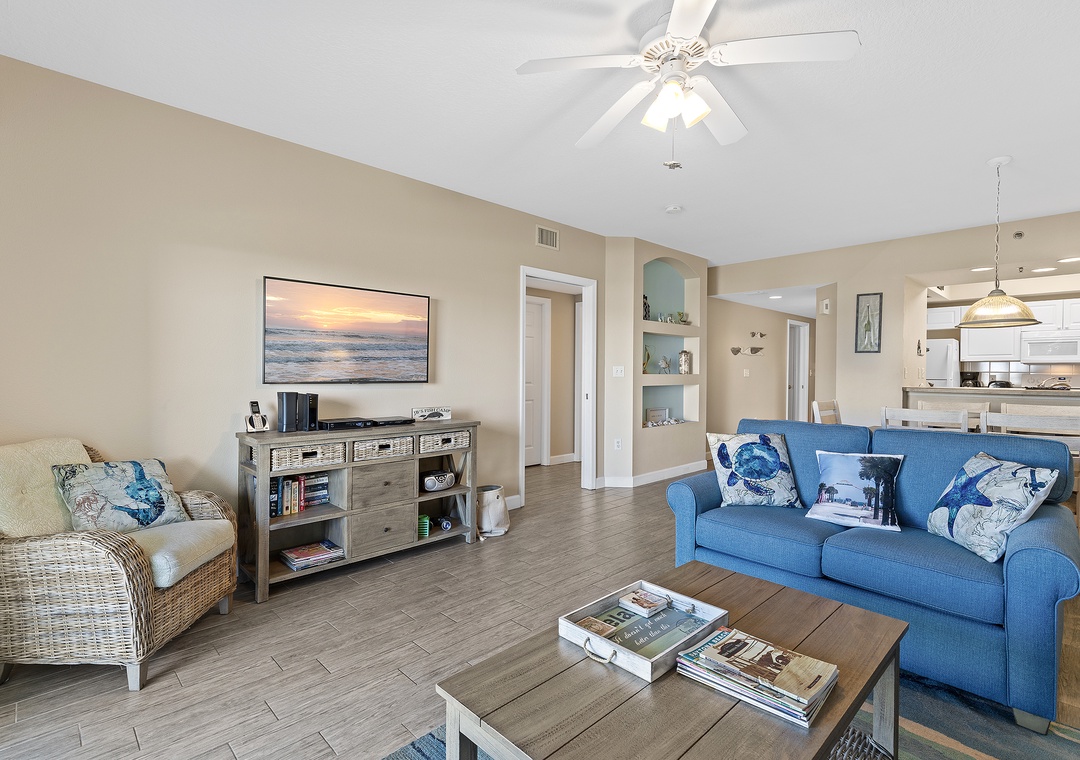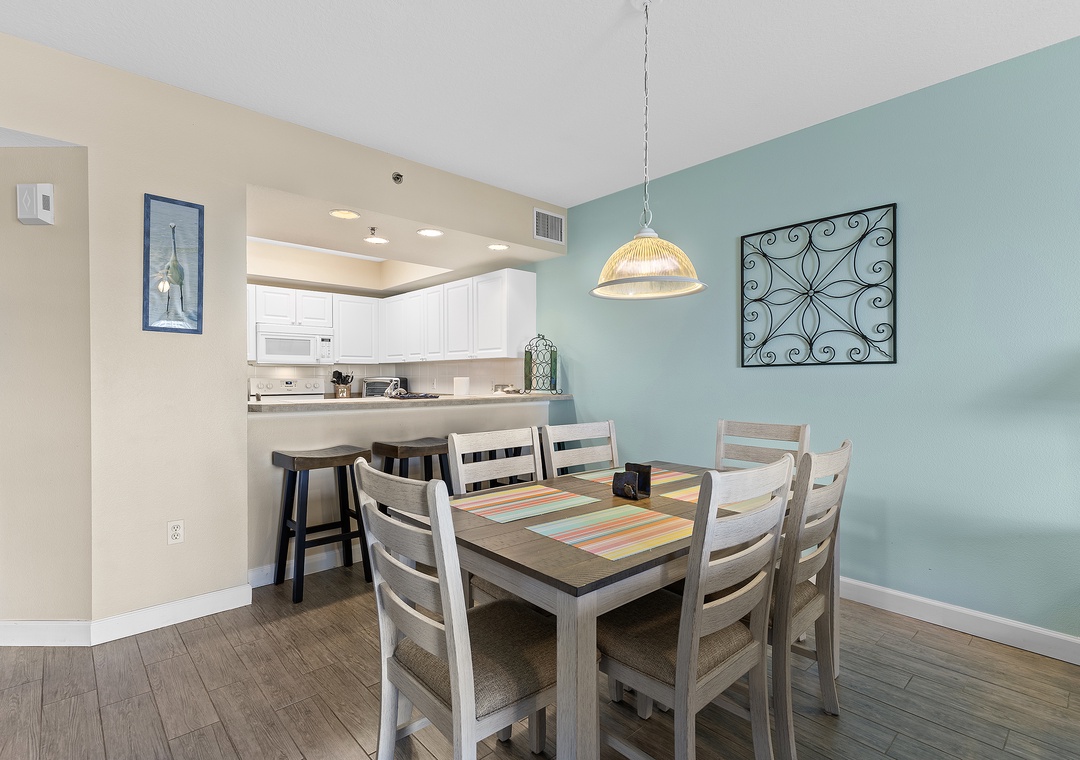The condo’s bright and airy décor features soothing teal walls, wood tile flooring, and wicker accents. A fully stocked kitchen with white cabinetry, sand-toned countertops, and bar seating makes meal prep a delight. Adjacent, the dining area and cozy living room with cushioned seating and a flat-screen TV provide spaces for relaxation and entertainment.