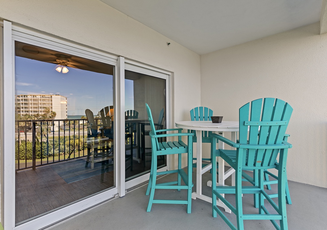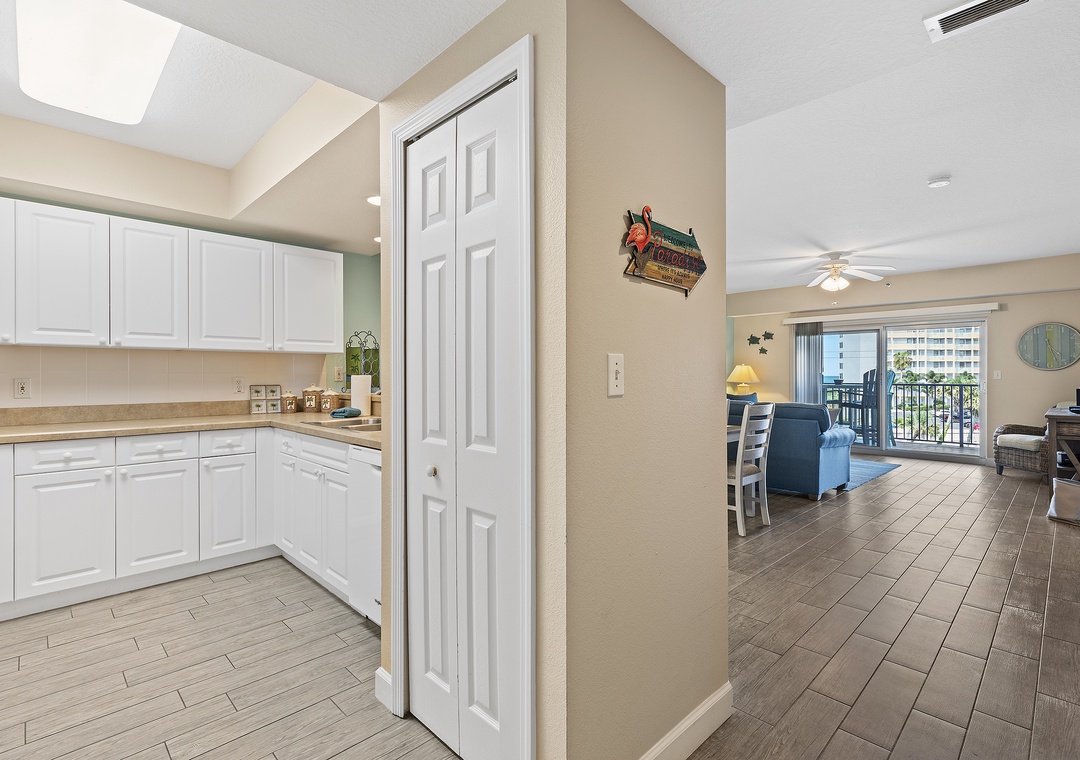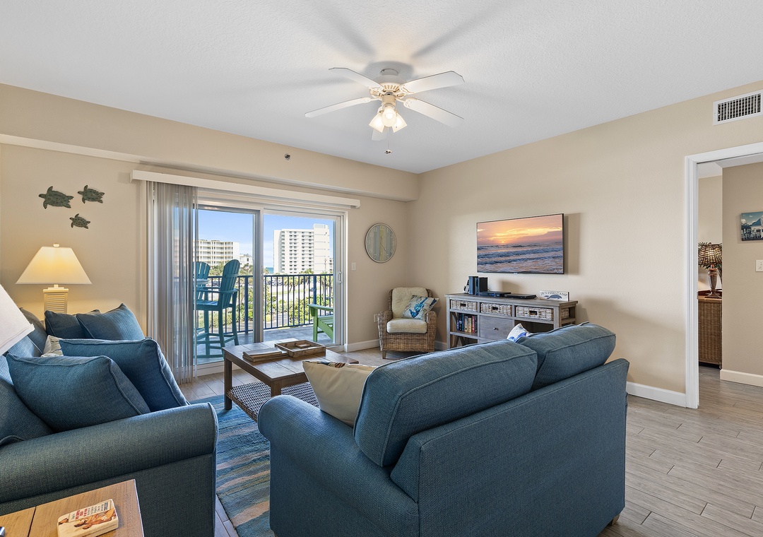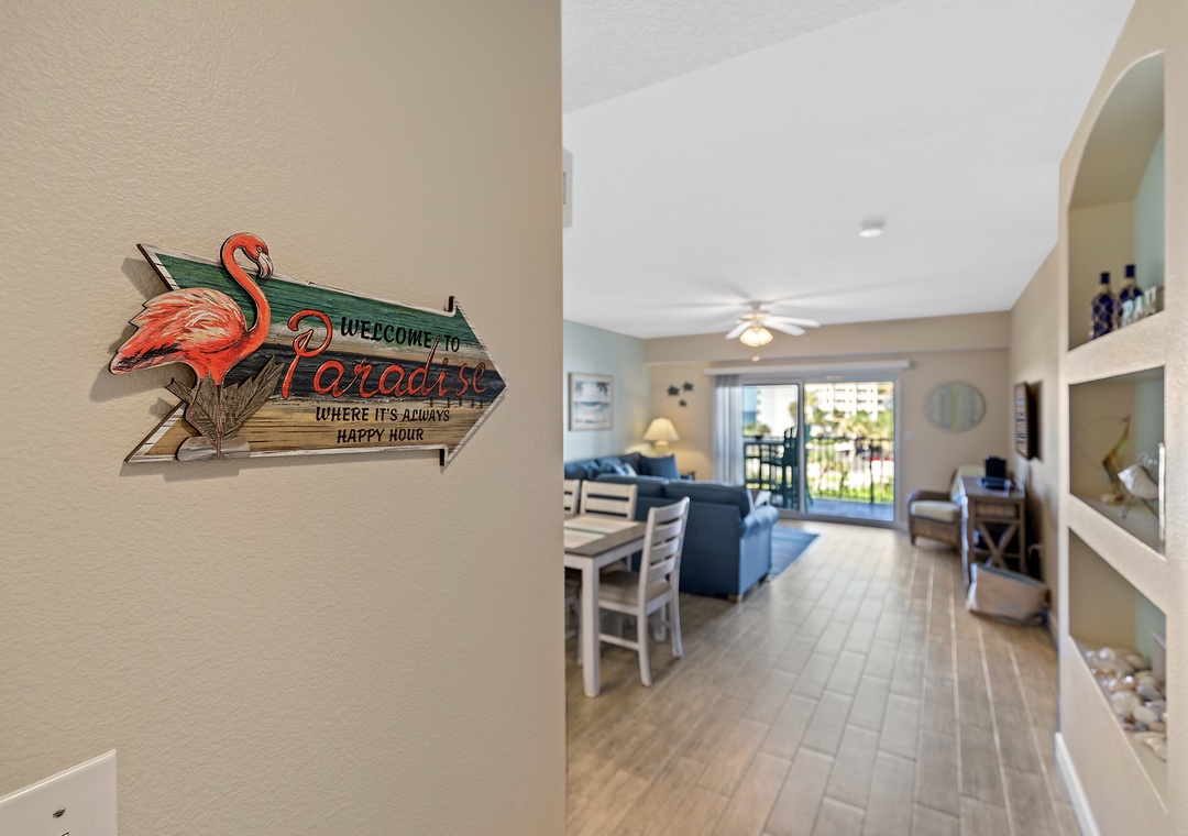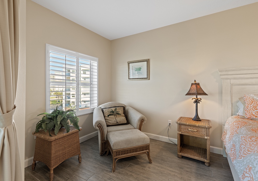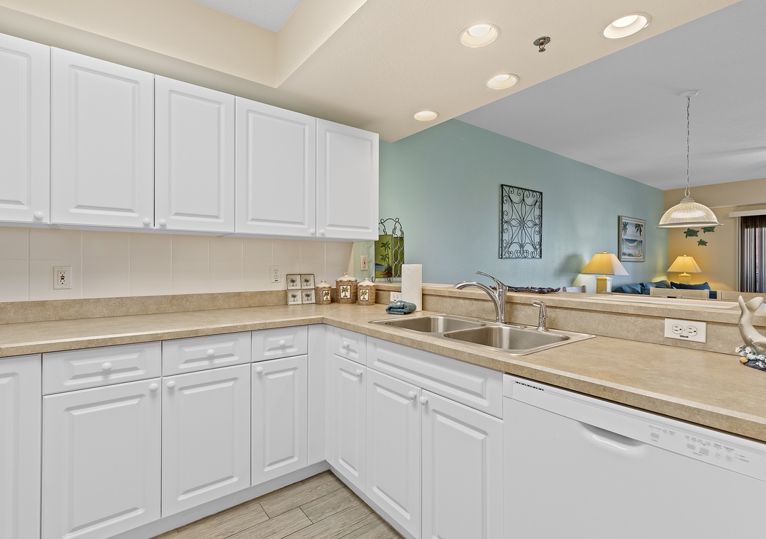 The condo’s bright and airy décor features soothing teal walls, wood tile flooring, and wicker accents. A fully stocked kitchen with white cabinetry, sand-toned countertops, and bar seating makes meal prep a delight. Adjacent, the dining area and cozy living room with cushioned seating and a flat-screen TV provide spaces for relaxation and entertainment.