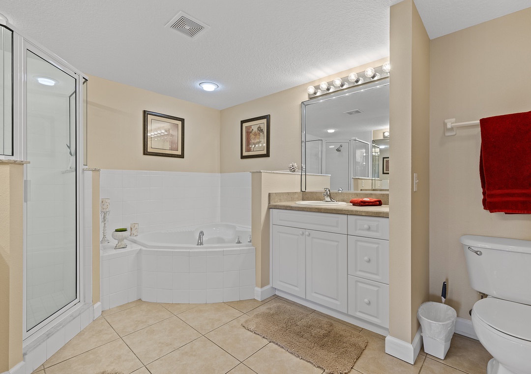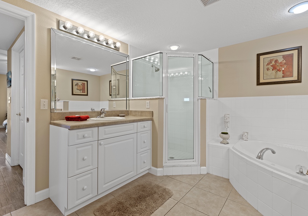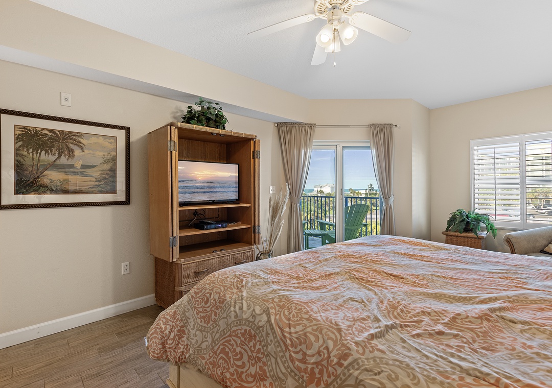 Step onto the furnished balcony to enjoy vibrant sunsets or a casual snack with friends. At night, retreat to the spacious primary suite with a king-size bed, private balcony, and luxurious en suite featuring a Jacuzzi tub and walk-in shower. Guests will also enjoy two additional bedrooms: one with a rustic queen bed and the other with twin beds, both designed for comfort.