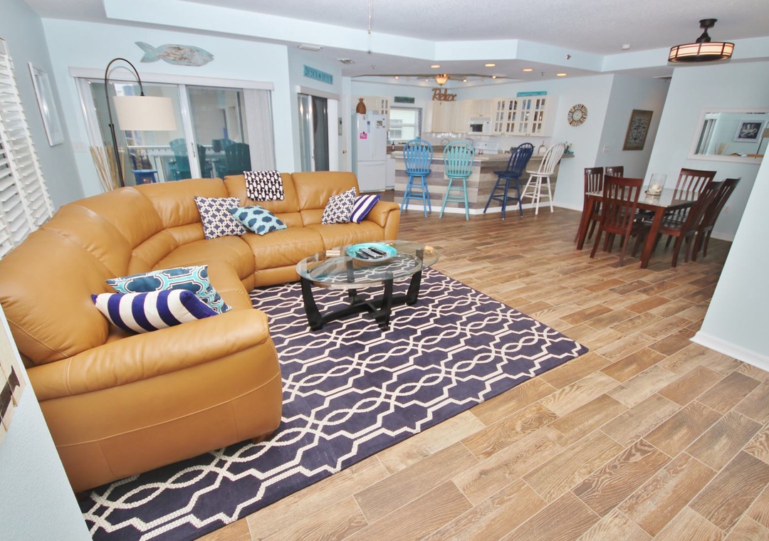 Oceanwalk 7-501 is a vibrant, modern 3-bedroom, 2-bathroom condo that offers the perfect beachside retreat for families and their pets. The spacious, 1,700-square-foot layout is filled with beachy blue hues and coastal accents, creating a relaxing atmosphere. The open living area features a plush leather sectional and flat-screen TV, while the fully equipped kitchen boasts cream cabinetry, marble countertops, and all the essentials for cooking. Enjoy meals at the dining table for six or the breakfast bar, and relax on the private balcony with its new screens, fans, and outdoor dining set.