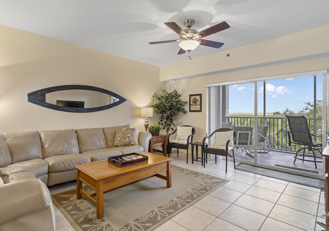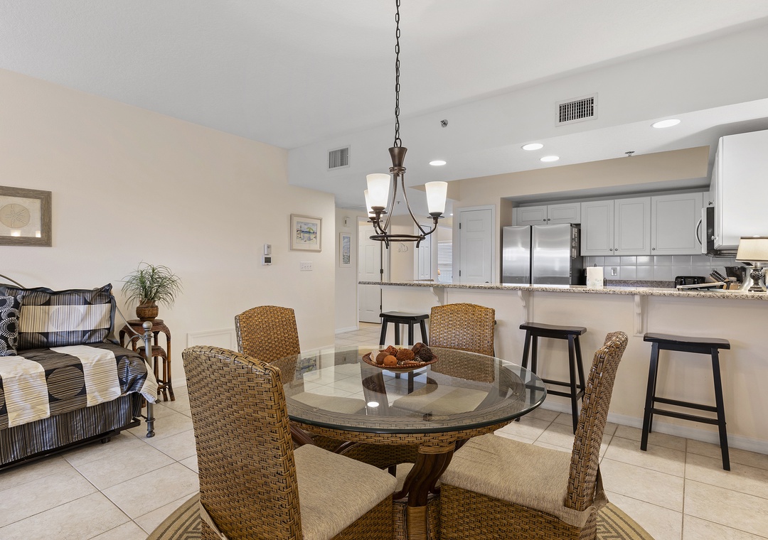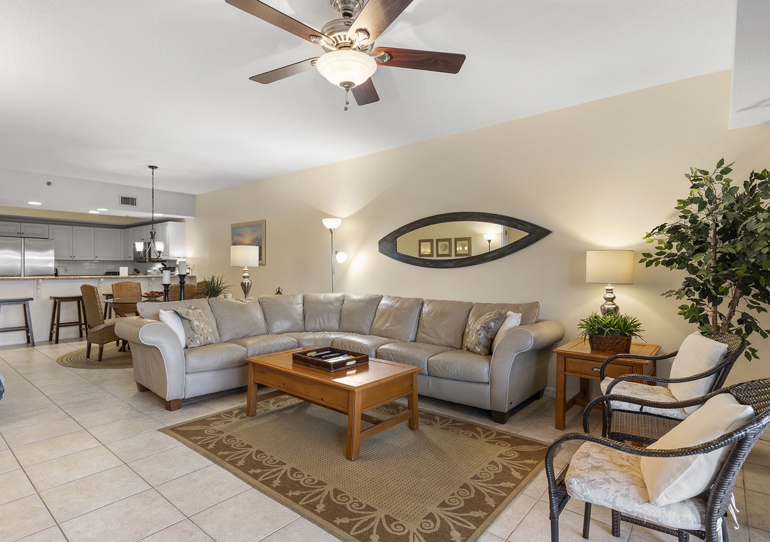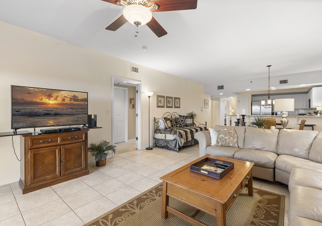 Oceanwalk 9-404 is a spacious 3-bedroom, 2-bathroom condo perfect for a family reunion or a friends' getaway, accommodating up to seven guests. The bright, open layout features a fully stocked kitchen with granite countertops, a cozy living room with a leather sectional and daybed trundle, and a dining area with seating for both casual and formal meals. The screened-in balcony offers a peaceful outdoor space with views of lush greenery, perfect for enjoying your morning coffee or an evening drink.