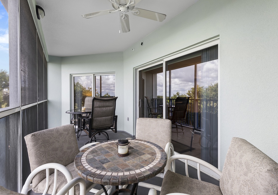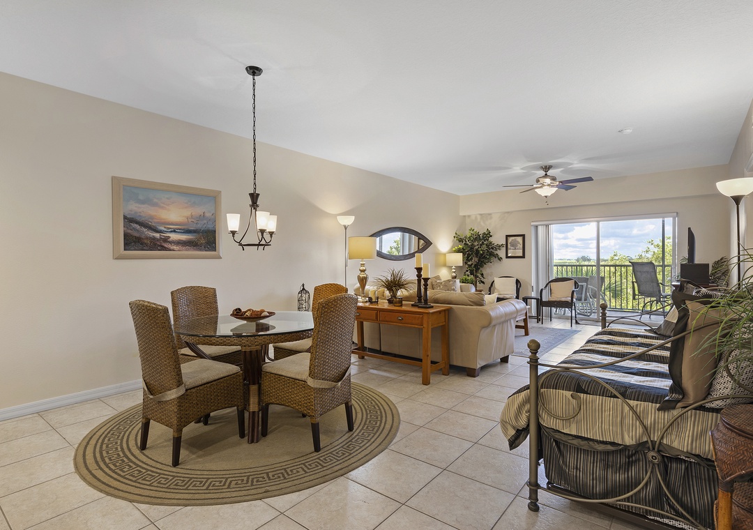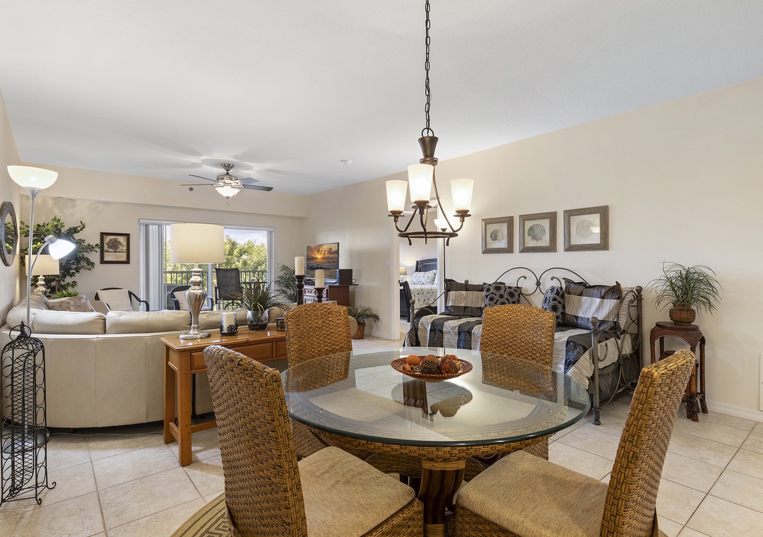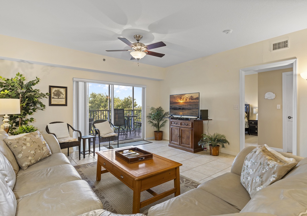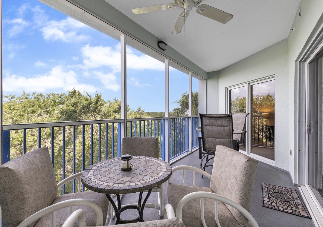 Oceanwalk 9-404 is a spacious 3-bedroom, 2-bathroom condo perfect for a family reunion or a friends' getaway, accommodating up to seven guests. The bright, open layout features a fully stocked kitchen with granite countertops, a cozy living room with a leather sectional and daybed trundle, and a dining area with seating for both casual and formal meals. The screened-in balcony offers a peaceful outdoor space with views of lush greenery, perfect for enjoying your morning coffee or an evening drink.