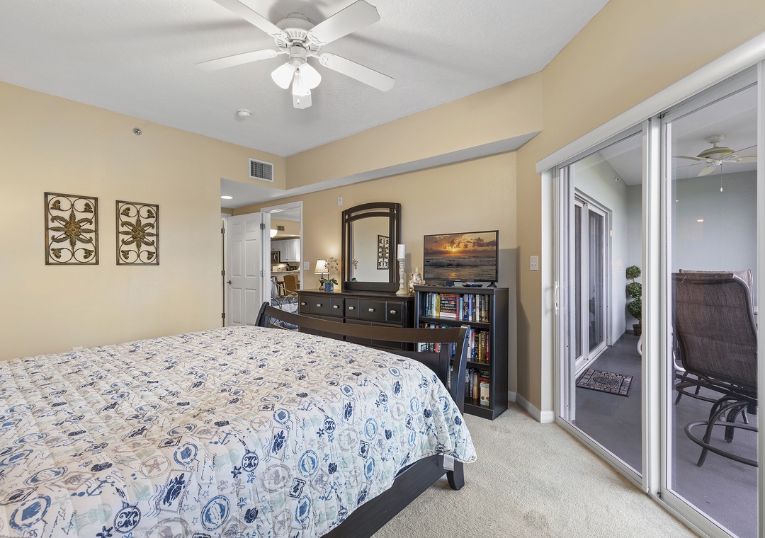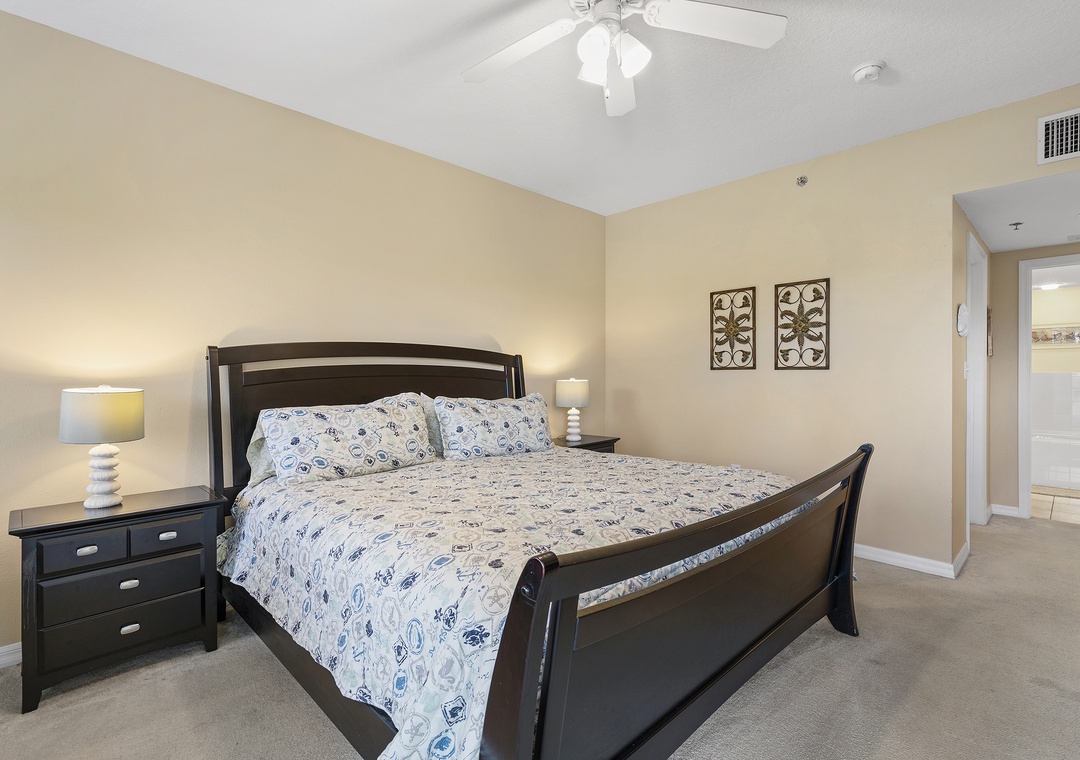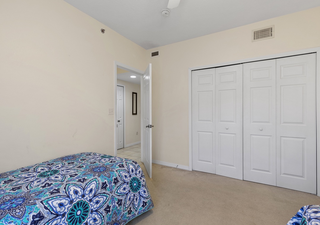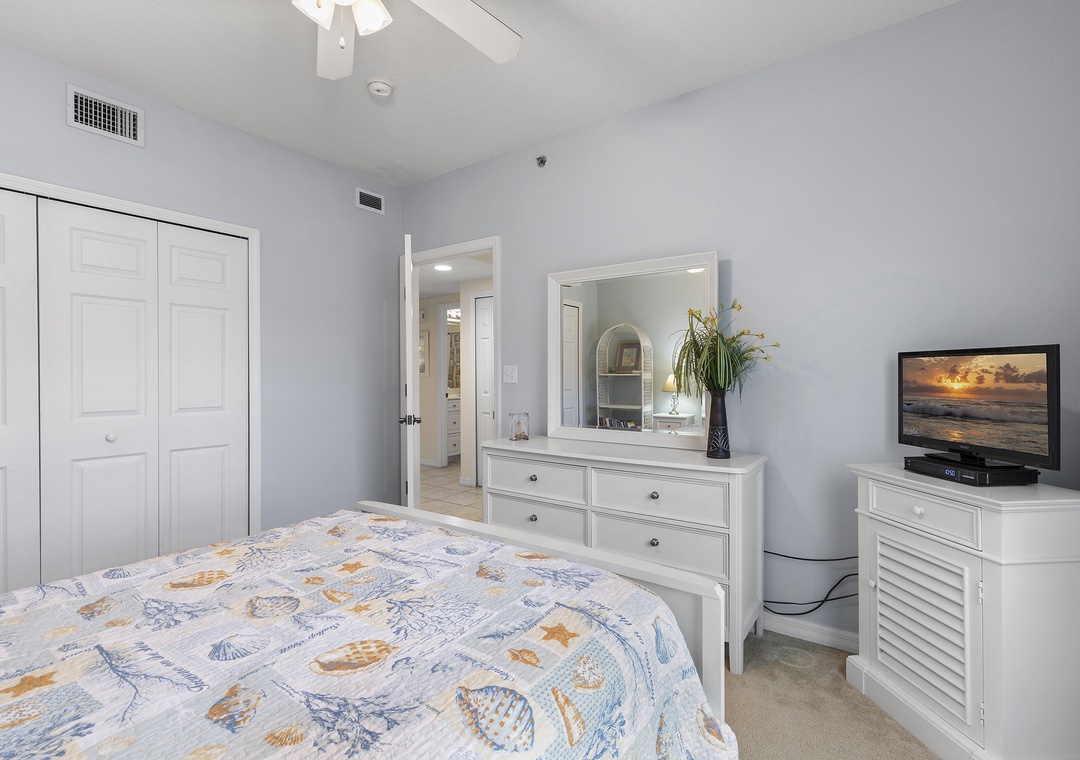 The primary bedroom features a king bed, private balcony access, and an ensuite bathroom with a jetted tub and walk-in shower. The two guest bedrooms provide comfortable sleeping arrangements, with a full bed in one room and two twin beds in the other, sharing a guest bathroom. This condo is fully equipped with linens, towels, beach chairs, a washer/dryer, and all the comforts of home, including free Wi-Fi, cable TV, and a DVD player. Beach access is just a short walk away, making this the ideal beachside retreat.