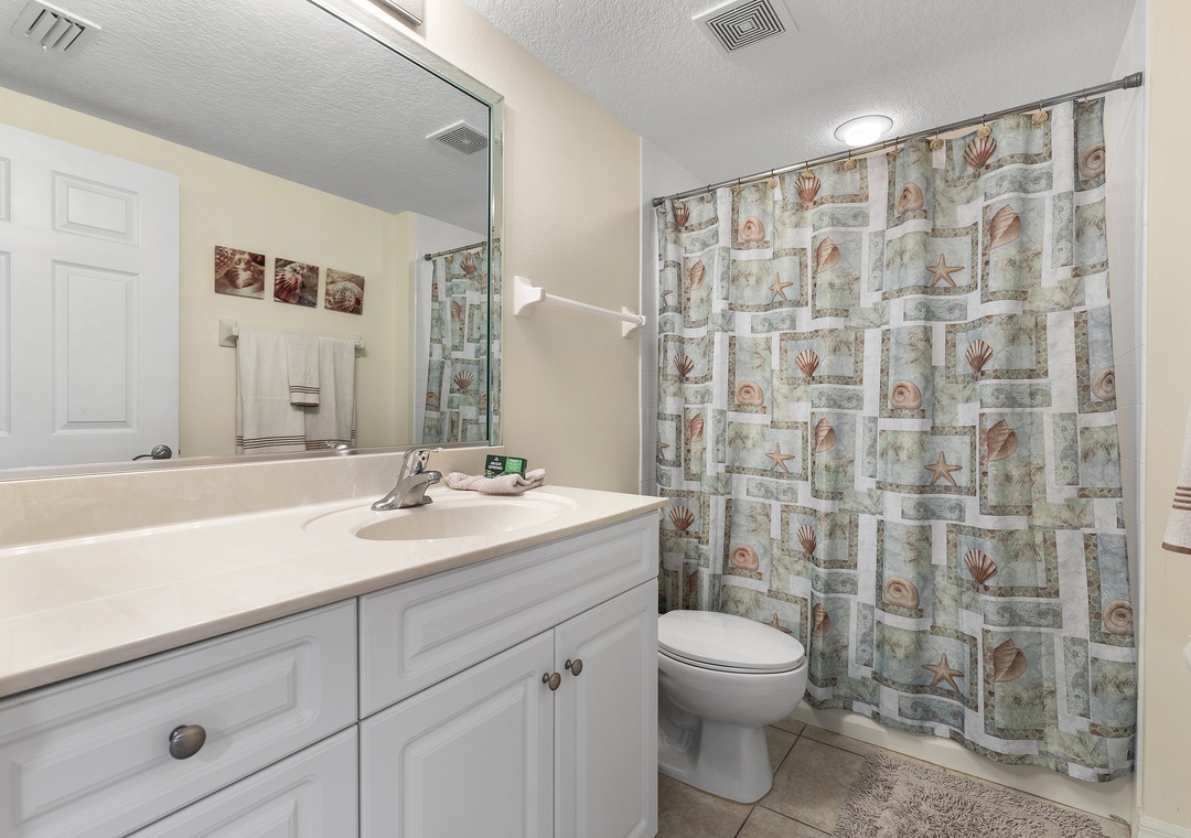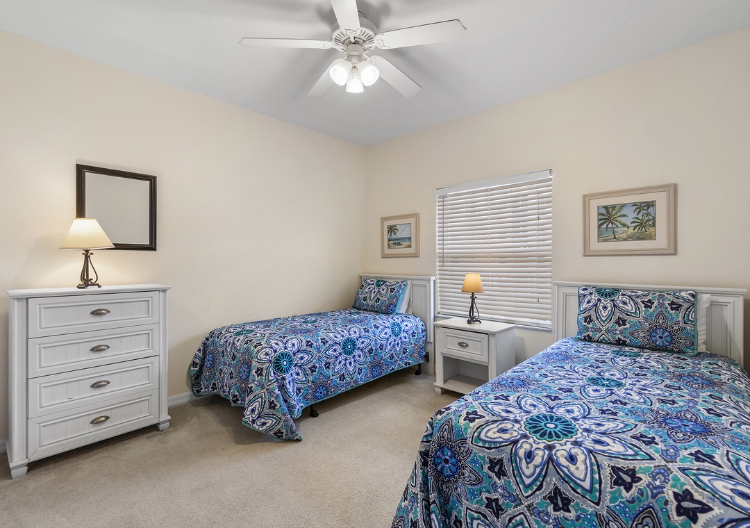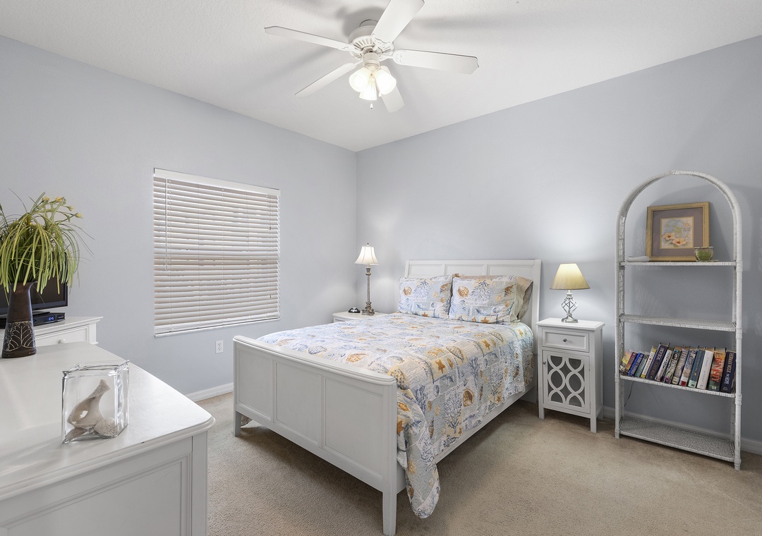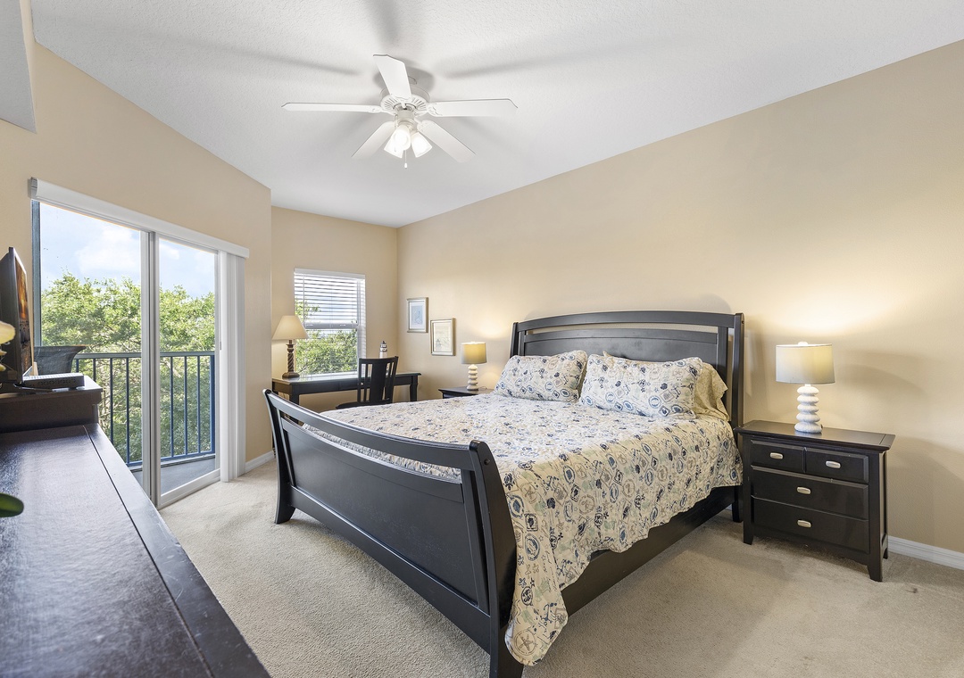 The primary bedroom features a king bed, private balcony access, and an ensuite bathroom with a jetted tub and walk-in shower. The two guest bedrooms provide comfortable sleeping arrangements, with a full bed in one room and two twin beds in the other, sharing a guest bathroom. This condo is fully equipped with linens, towels, beach chairs, a washer/dryer, and all the comforts of home, including free Wi-Fi, cable TV, and a DVD player. Beach access is just a short walk away, making this the ideal beachside retreat.