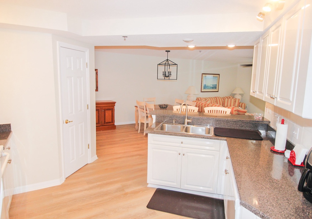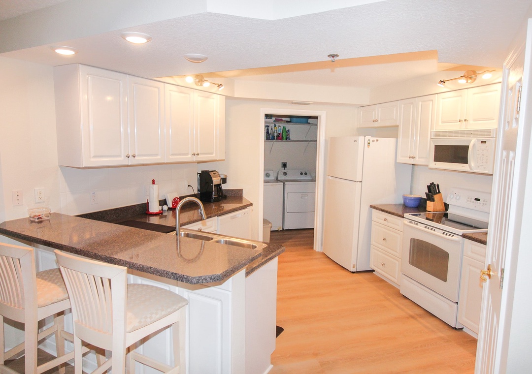 Indulge your inner chef in the fully equipped kitchen, adorned with pristine white cabinets and complemented by striking dark granite countertops that create an appealing contrast. With its generous layout, this spacious kitchen provides ample room to prepare and savor delicious meals. It boasts a range of convenient features, including white appliances, a Keurig coffee maker, a drip coffee maker, a complete set of dishes and silverware, a toaster, a blender, a dishwasher, and a microwave, ensuring all your culinary needs are met with ease and convenience. This space makes every mealtime a delightful experience during your stay.