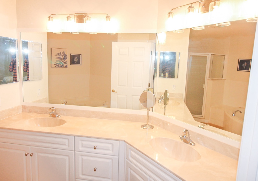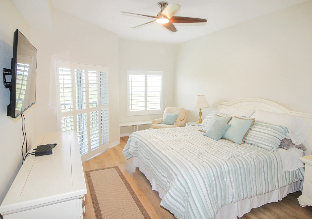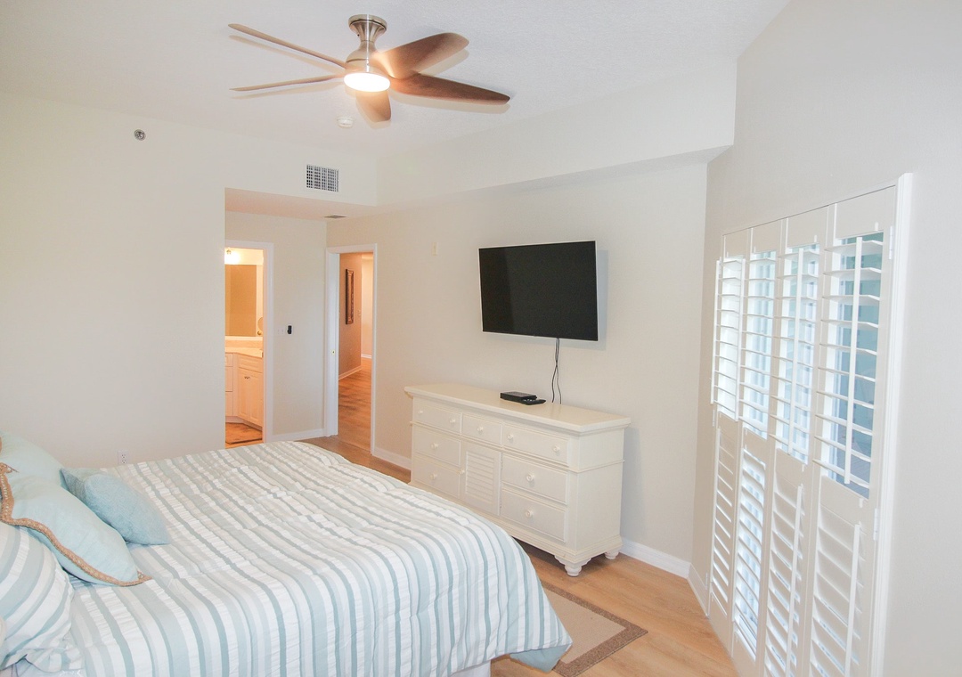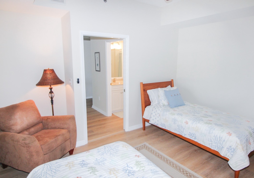 Once it’s time to rest after a fun day at Florida’s favorite east coast beach, the primary bedroom awaits as your ultimate sanctuary. With calming blue hues and a large luxurious en-suite bathroom, this space ensures you will find the relaxation you have been searching for. As for the rest of your group, two members will enjoy a restful slumber in the second bedroom, thoughtfully furnished with two comfortable twin beds.