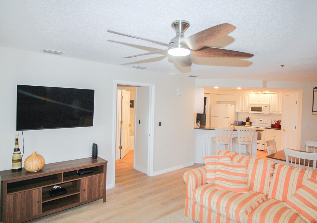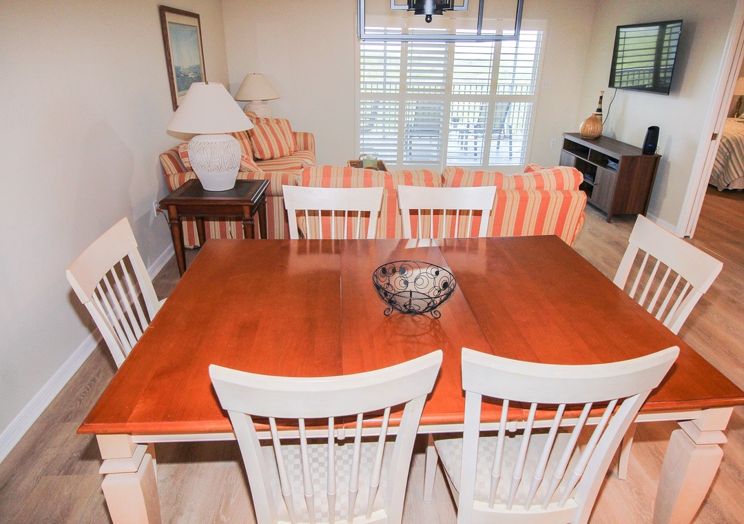 As you step into this open-concept condo, you will be greeted with warm wood floors that span the entire property. The living room is furnished with two striped sofas (one of which is a sleeper sofa) and a matching ottoman. This space is also equipped with a Smart TV. Don’t worry if you can’t find your Netflix password because streaming services are provided. The sliding glass doors not only provide access to the balcony but also allow natural light to illuminate the space. The balcony is furnished with a dining table for four and two lounge chairs. A lush estuary provides a stunning backdrop for the balcony.