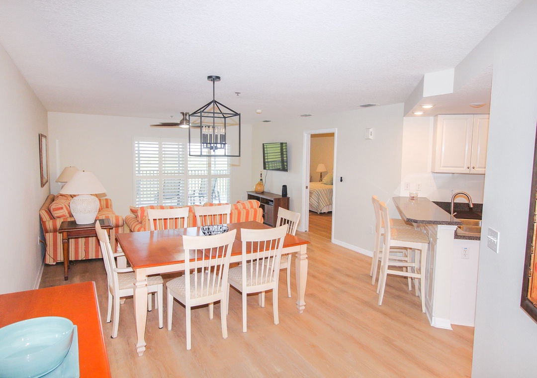 Step into the adjacent dining area, featuring a stylish rectangular table and six comfortable chairs, creating the perfect setting for you and your group of five to gather and share stories of your unforgettable NSB adventures. And for more casual meals or quick bites, the nearby kitchen provides extra seating for two at the convenient breakfast bar.