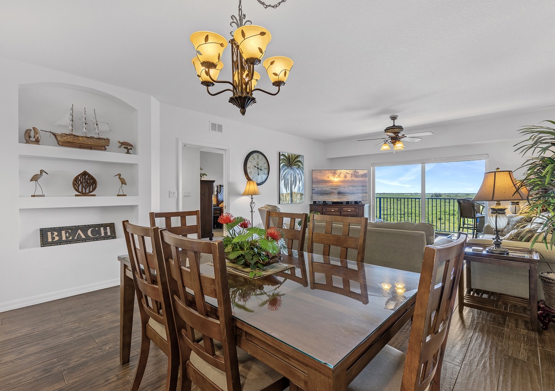 In the Living Room, you'll find gorgeous furniture, plenty of seating, and sliding glass doors to the patio. To ensure everyone has a spot to relax, the living area has a comfortable couch, large love seat, and wonderful leather lazy boy. From this room, enjoy easy access to the balcony where there are chairs and a table for dining or relaxing while overlooking the beautiful reserve backing up right to your screened-in porch. The Living Room is also equipped with a 65" 4 K Smart TV and a DVD Player.