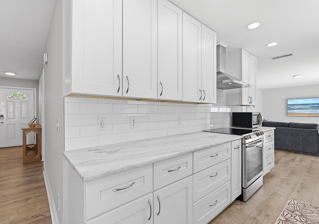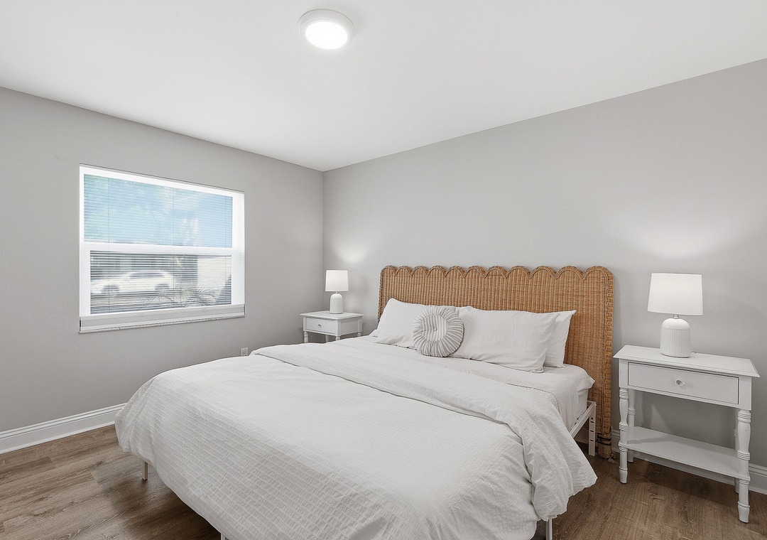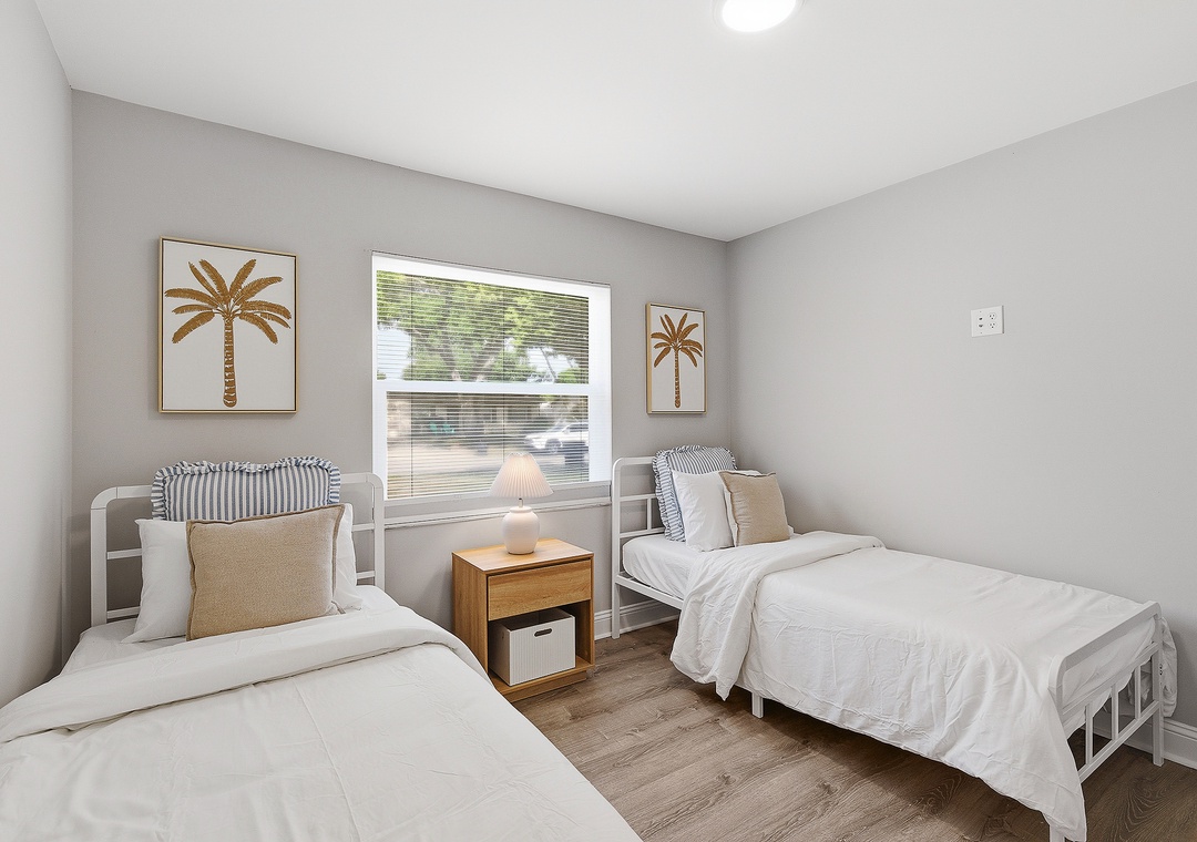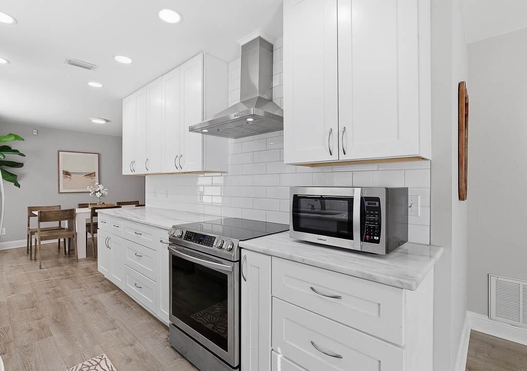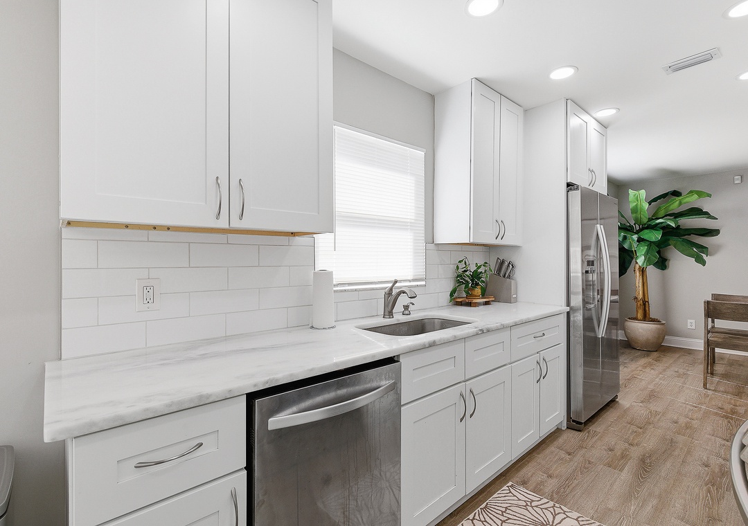 Welcome to your perfect Port Orange getaway—a completely renovated, comfortable, family-focused, single-level home just 4 miles from Daytona Beach. This spacious 3-bedroom, 2-bathroom home comfortably accommodates up to 8 guests and features a split floorplan for added privacy. The primary bedroom offers a king bed and a private ensuite with a walk-in shower, while the guest bedrooms include one with a queen bed and another with two twin beds. A sleeper sofa in the living room provides additional sleeping space. Designed to bring people together, the home has a single TV in the living room to encourage conversation and quality time. The galley kitchen, equipped with stainless steel appliances, flows seamlessly into both the living room and dining area, where a table seats six with additional seating nearby for extra guests.