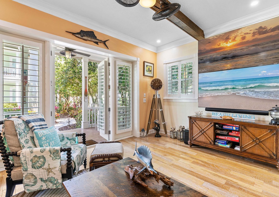 From the moment you step onto the brick paver driveway and take in the pastel-colored home and charming front porch, a sense of cheerful belonging greets you. The coastal-themed living room with substantial seating and maritime décor offers a perfect spot to unwind or entertain. The ambiance is further enhanced by natural light pouring in through plantation shutters, setting the scene for unforgettable memories.