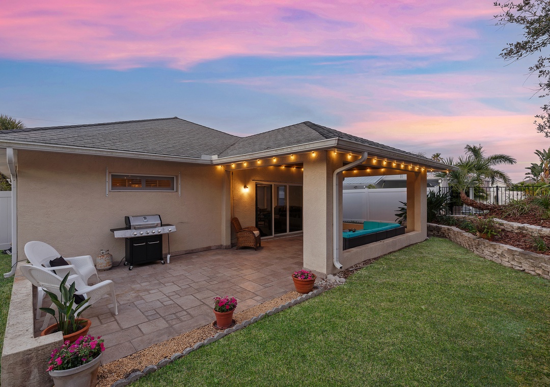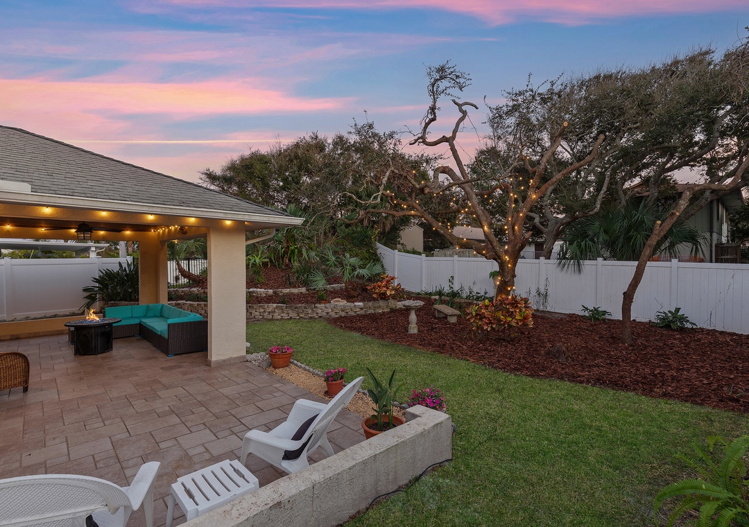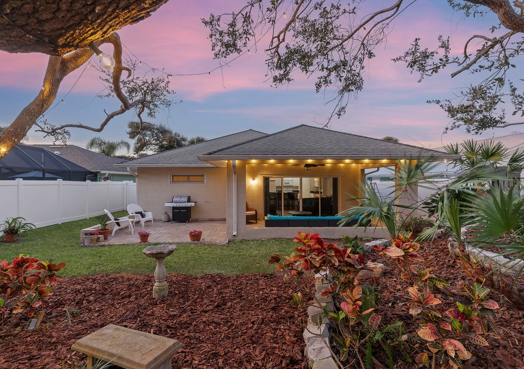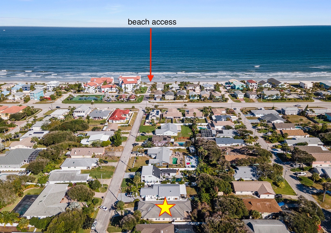 Welcome to Palm Haven! This beautiful one-level, 4-bedroom beach house offers driveway parking for up to four vehicles and an easy, flat walk straight to the beach, with direct beach access just a few blocks away on the same street. Designed for comfort and relaxation, the home offers a calm and peaceful atmosphere that is ideal for unwinding and enjoying quality time away. It features a king bedroom with an ensuite bath, a queen bedroom with an ensuite bath, a twin bedroom with two beds, and a fourth bedroom with a futon double bed and desk that can also serve as a home office. All four bedrooms, as well as the den, are equipped with TVs. The den opens to an inviting patio with comfortable outdoor seating, a firepit, ceiling fan, string lights, and exterior lighting that create enchanting, relaxing vibes. The fully fenced yard offers privacy, a perfectly manicured lawn ideal for kids to play, and is pet-friendly for up to two dogs (fees apply). Additional amenities include a washer and dryer, a spacious living room and dining room, and an open kitchen with bar seating and a cozy breakfast nook. Ideal for families or friends, this serene getaway is conveniently located near Publix, Bealls, and local eateries.