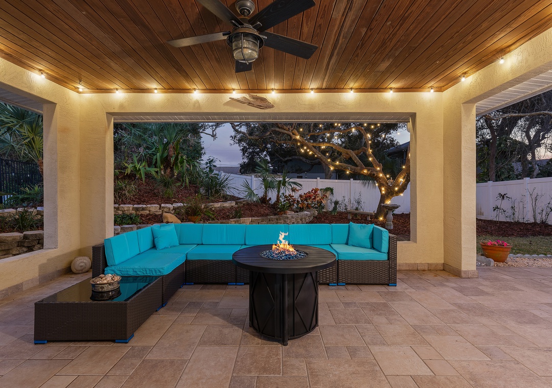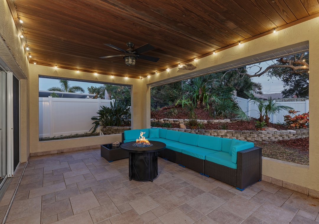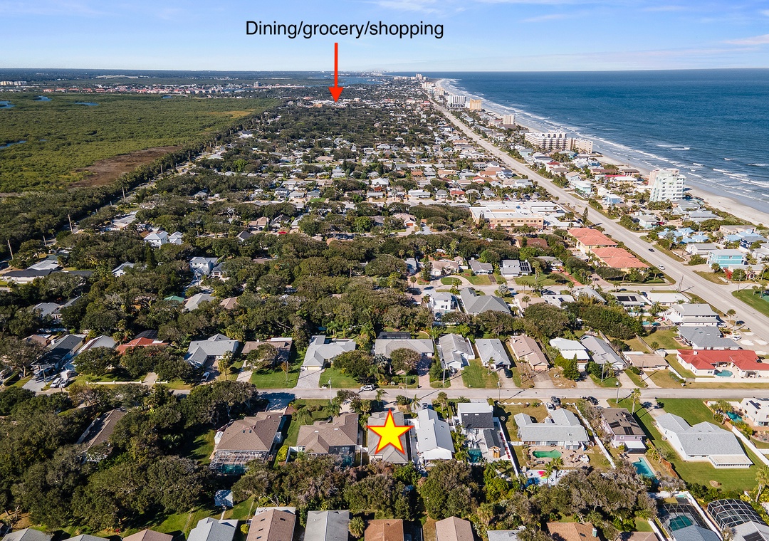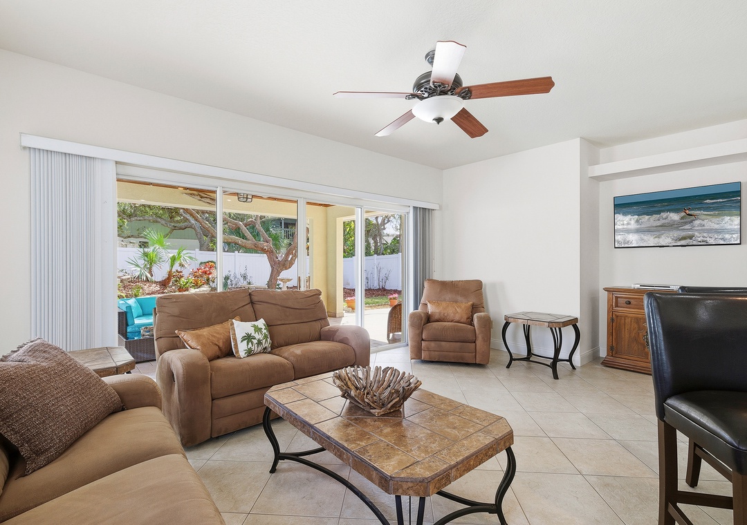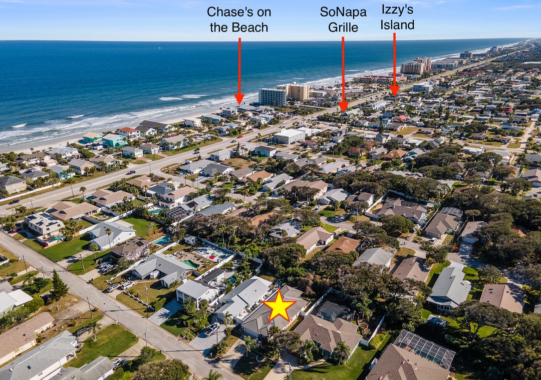 Welcome to Palm Haven! This beautiful one-level, 4-bedroom beach house offers driveway parking for up to four vehicles and an easy, flat walk straight to the beach, with direct beach access just a few blocks away on the same street. Designed for comfort and relaxation, the home offers a calm and peaceful atmosphere that is ideal for unwinding and enjoying quality time away. It features a king bedroom with an ensuite bath, a queen bedroom with an ensuite bath, a twin bedroom with two beds, and a fourth bedroom with a futon double bed and desk that can also serve as a home office. All four bedrooms, as well as the den, are equipped with TVs. The den opens to an inviting patio with comfortable outdoor seating, a firepit, ceiling fan, string lights, and exterior lighting that create enchanting, relaxing vibes. The fully fenced yard offers privacy, a perfectly manicured lawn ideal for kids to play, and is pet-friendly for up to two dogs (fees apply). Additional amenities include a washer and dryer, a spacious living room and dining room, and an open kitchen with bar seating and a cozy breakfast nook. Ideal for families or friends, this serene getaway is conveniently located near Publix, Bealls, and local eateries.